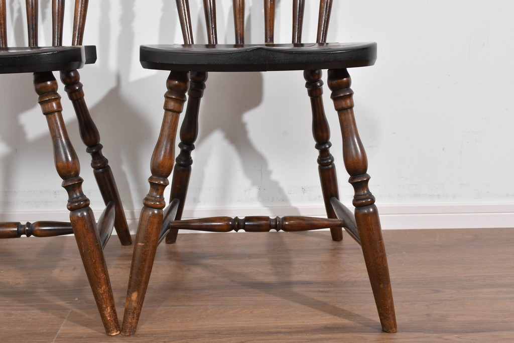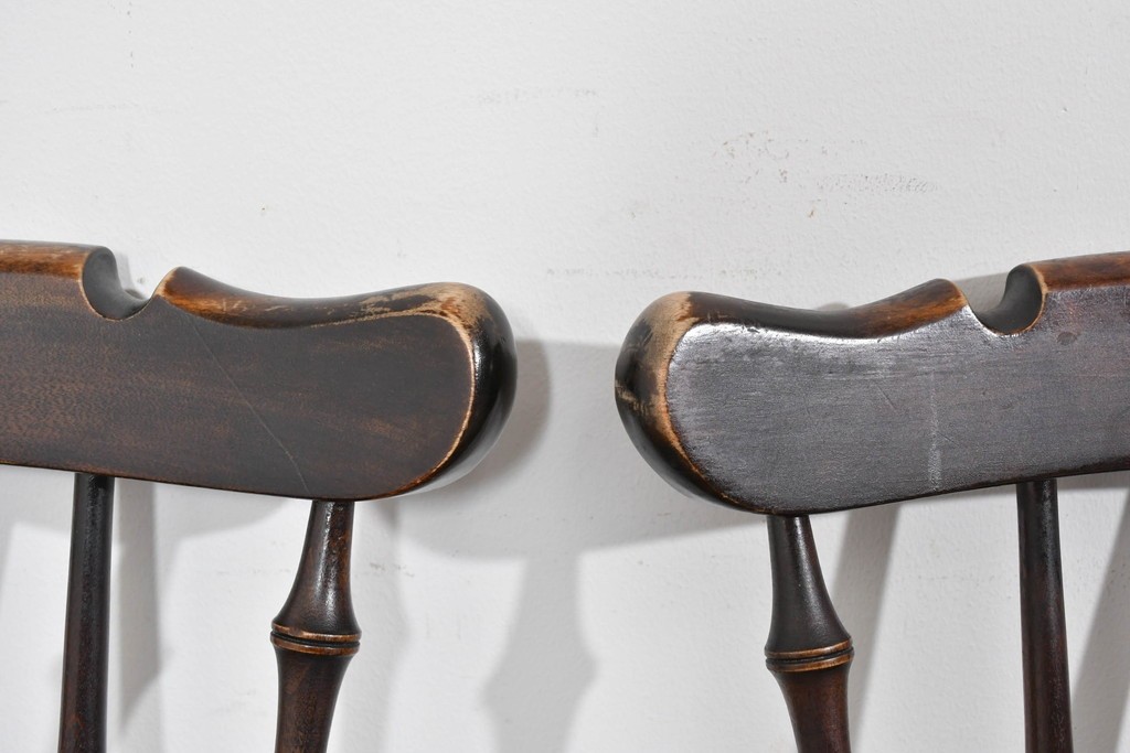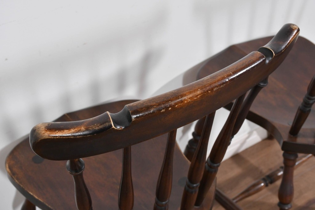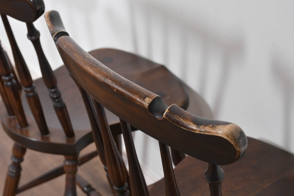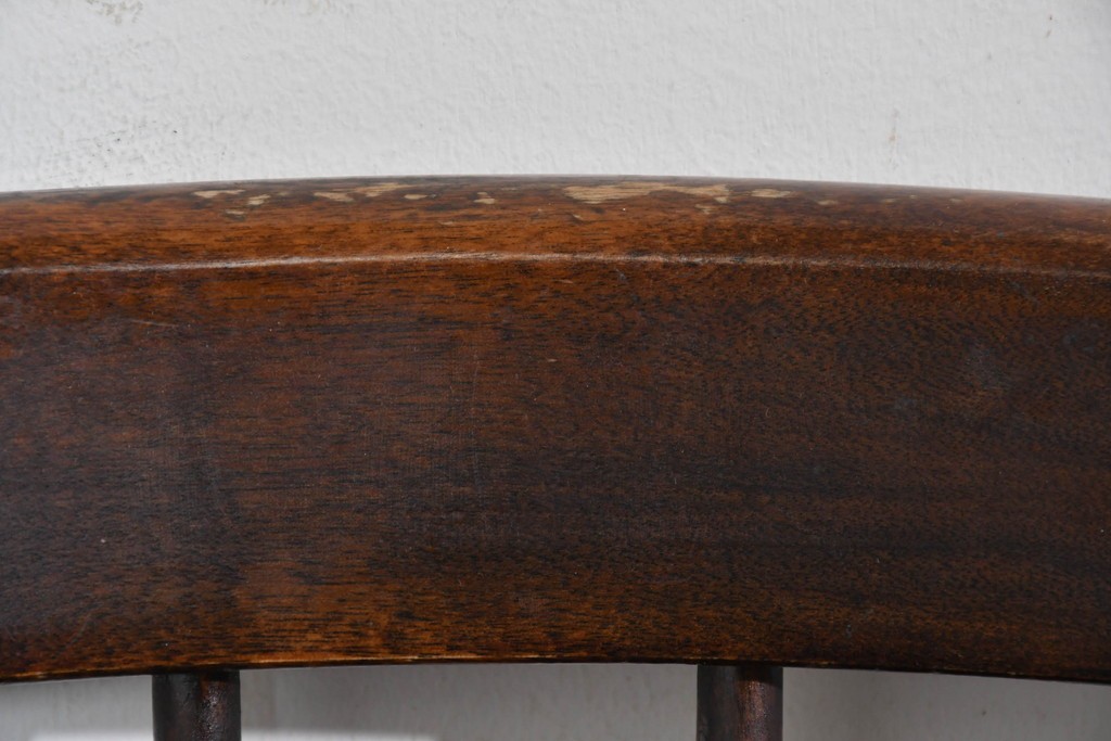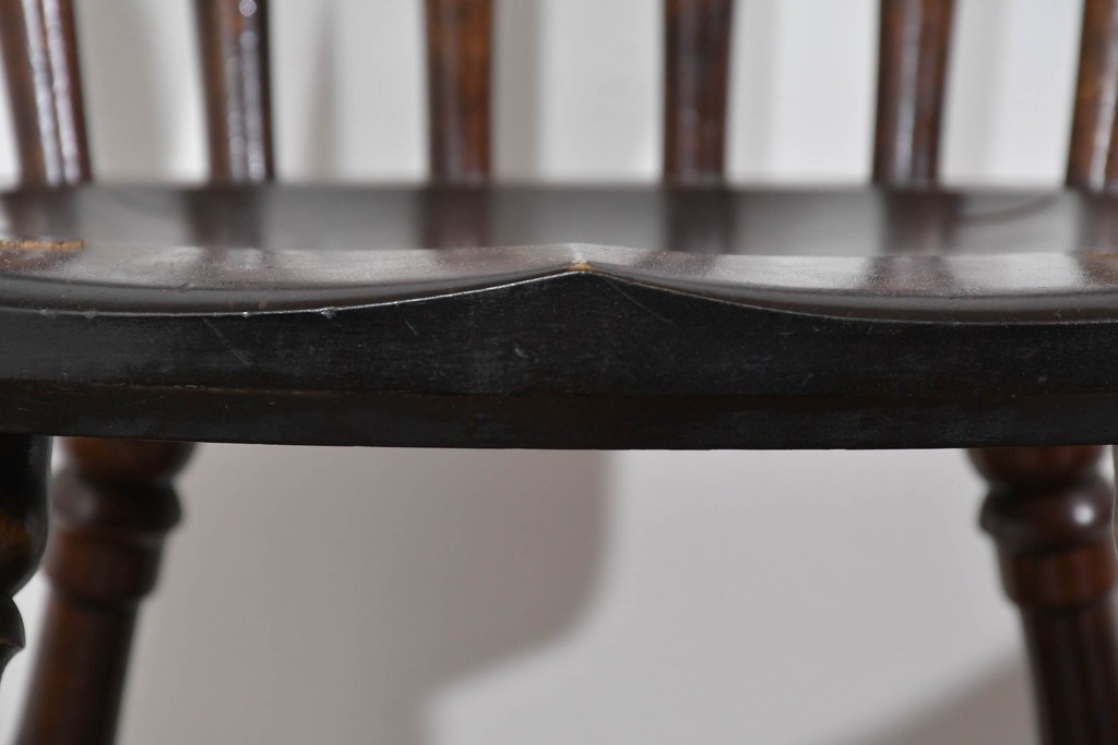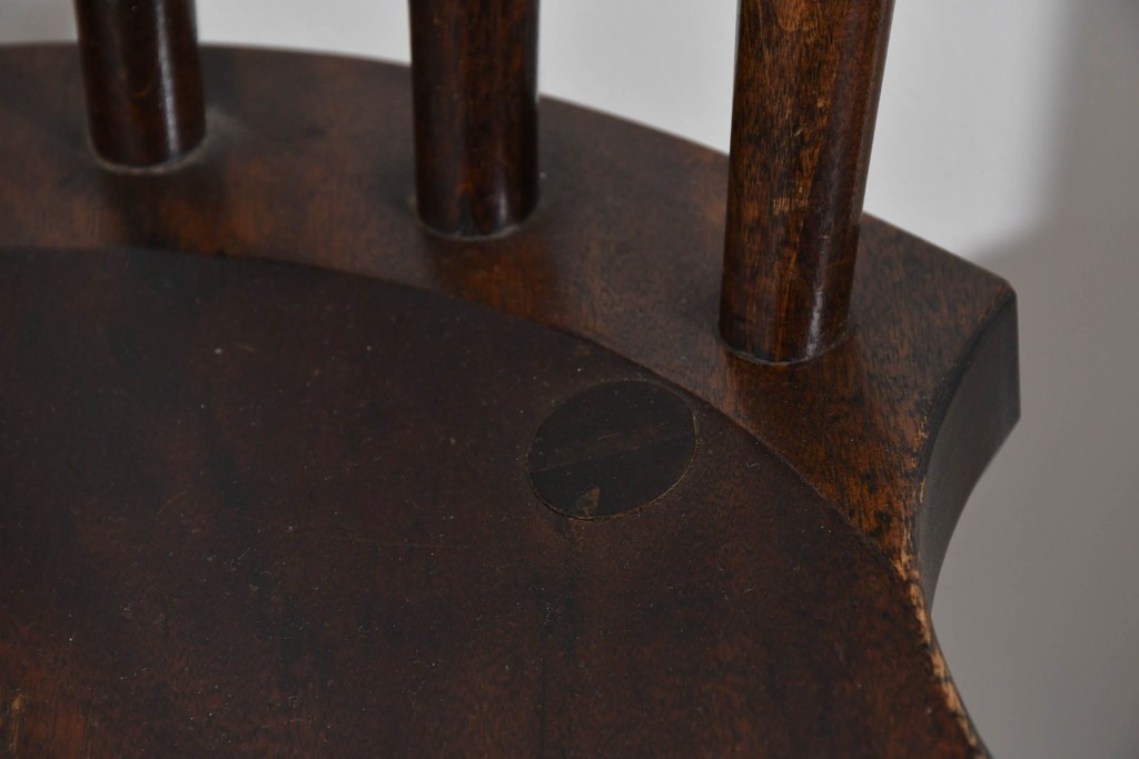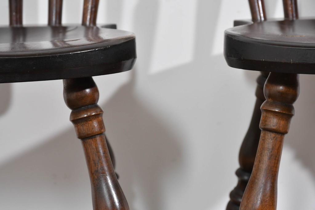 背もたれや脚部に施された挽物意匠が特徴で、民芸家具らしい温かみと存在感を感じられる一脚です。