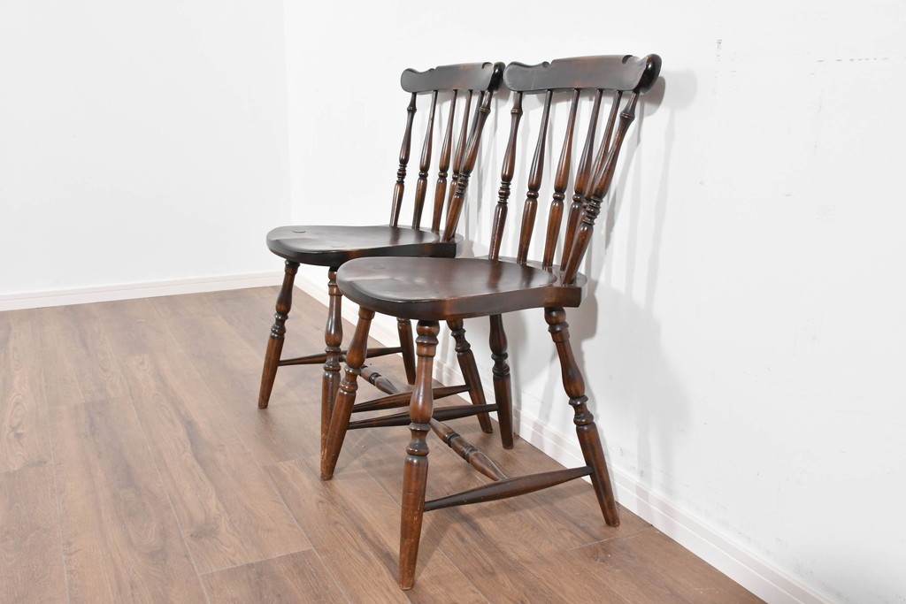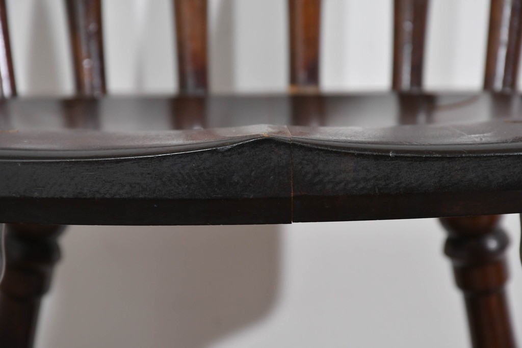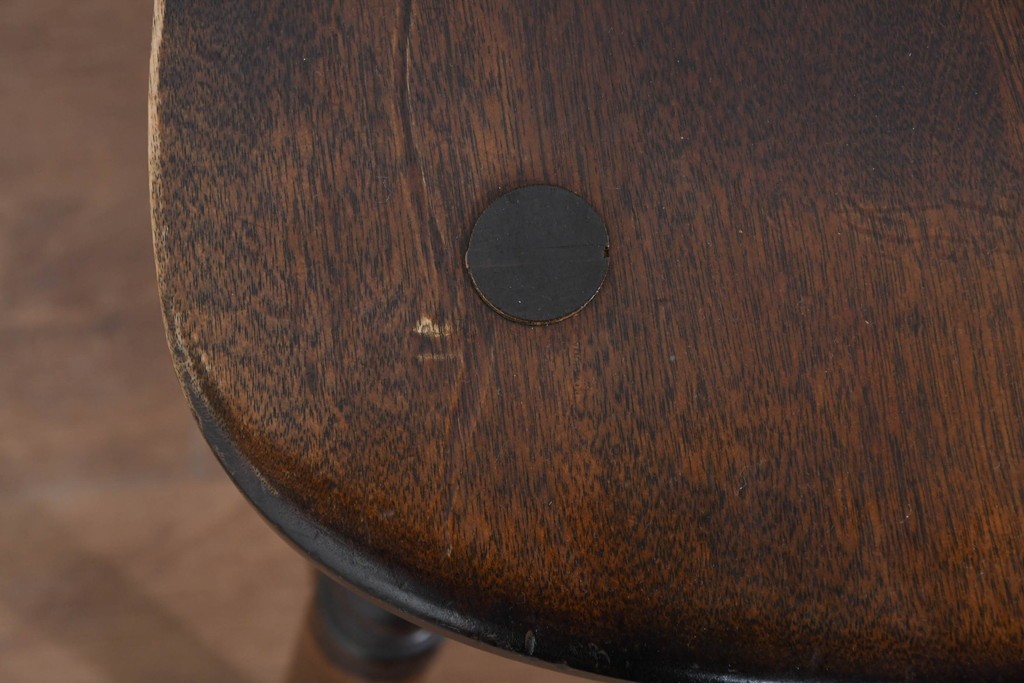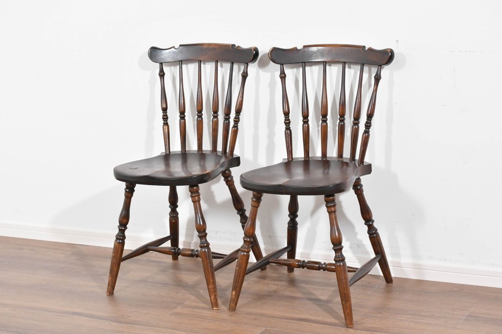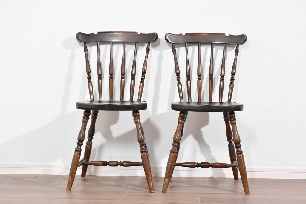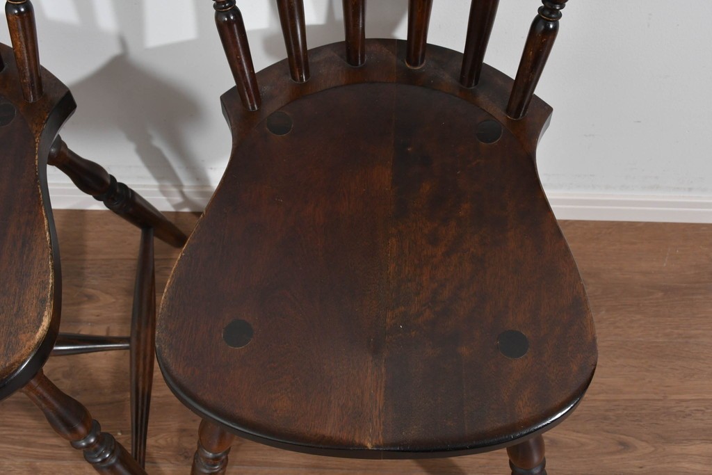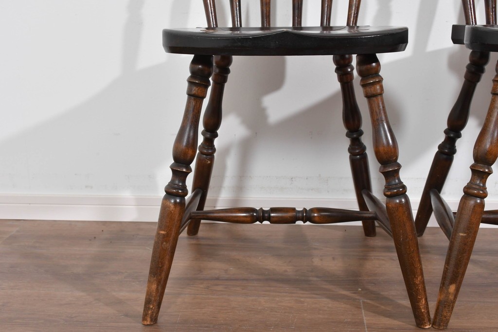 背もたれや脚部に施された挽物意匠が特徴で、民芸家具らしい温かみと存在感を感じられる一脚です。