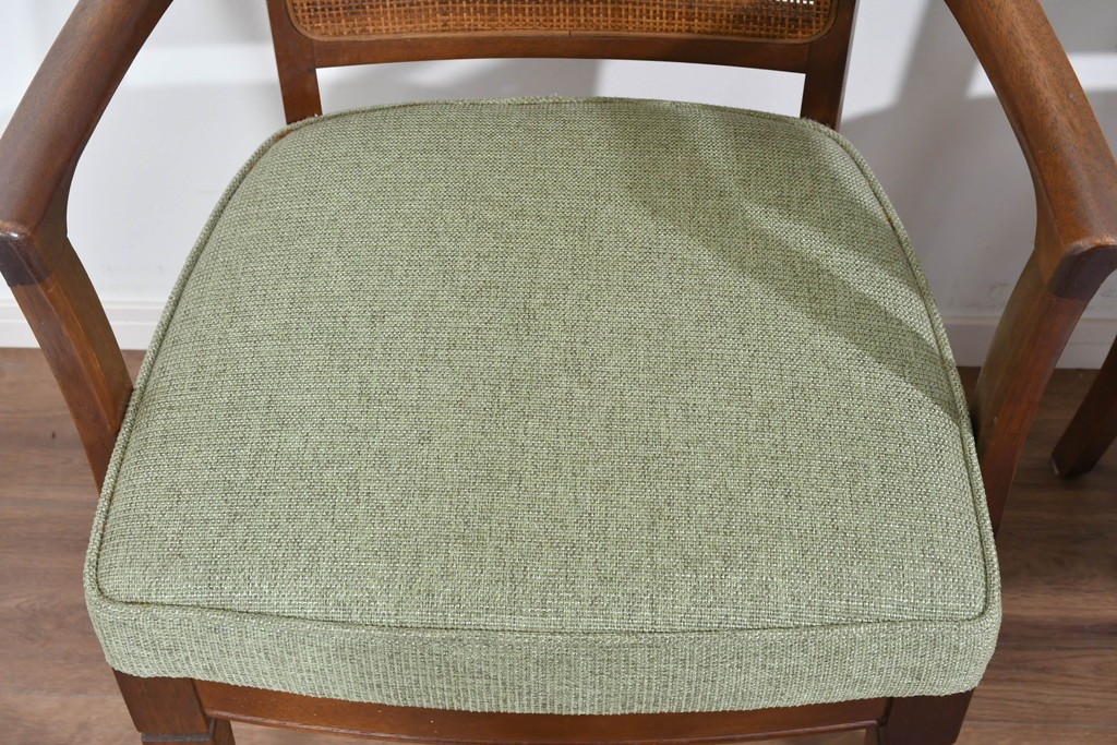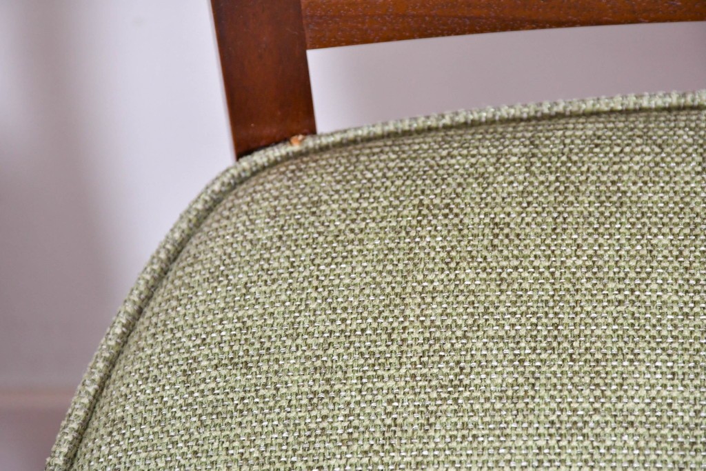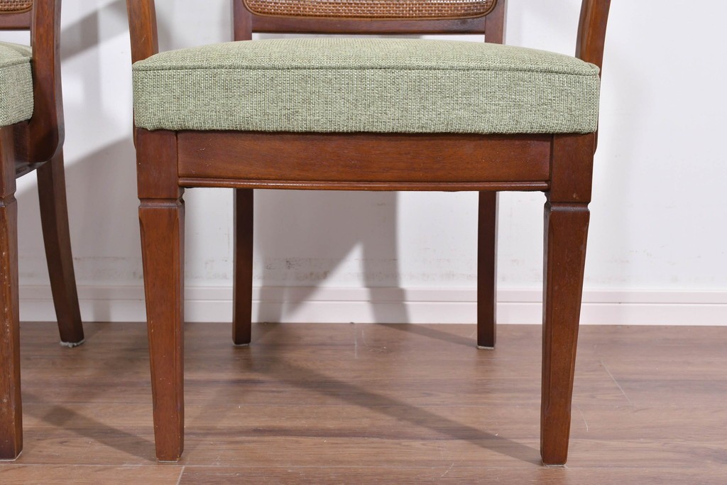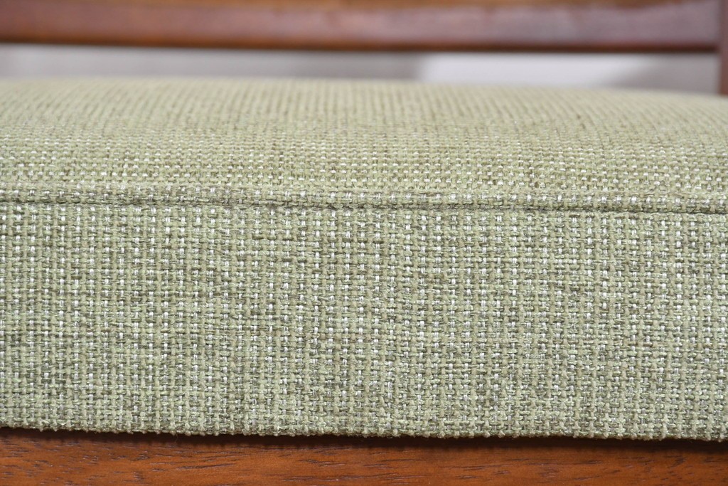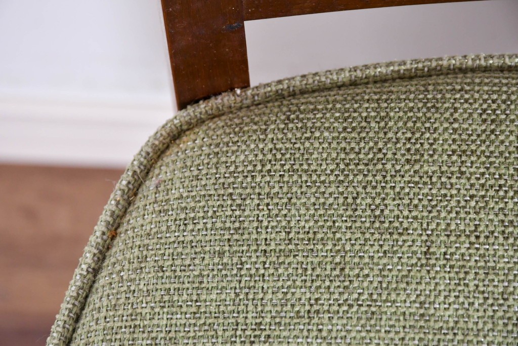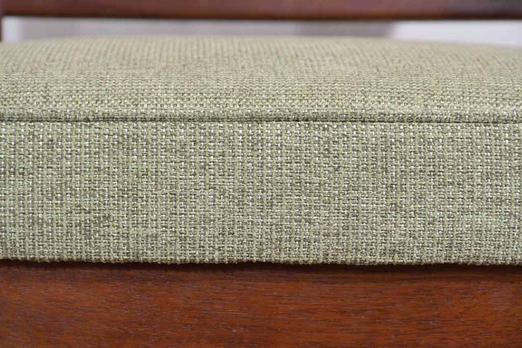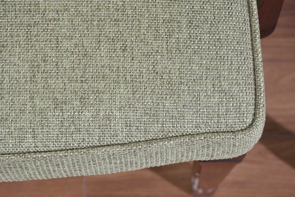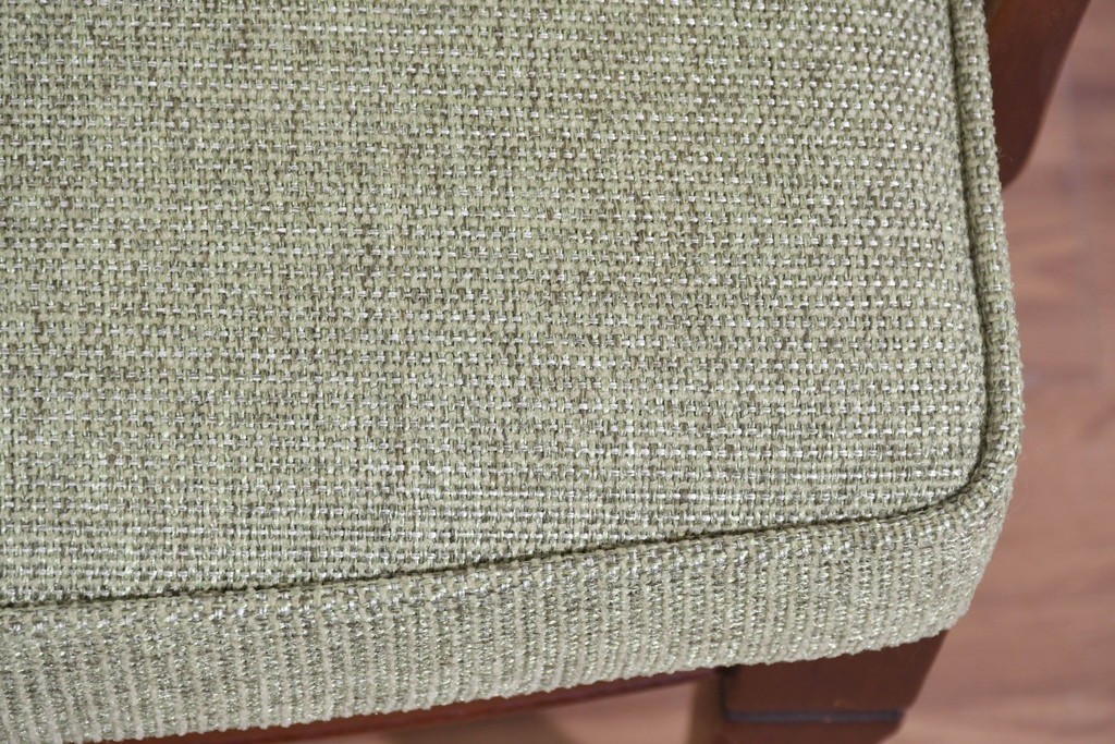 淡いグリーンの座面生地が木部の色合いと調和し、落ち着いた印象で空間に馴染みます。
