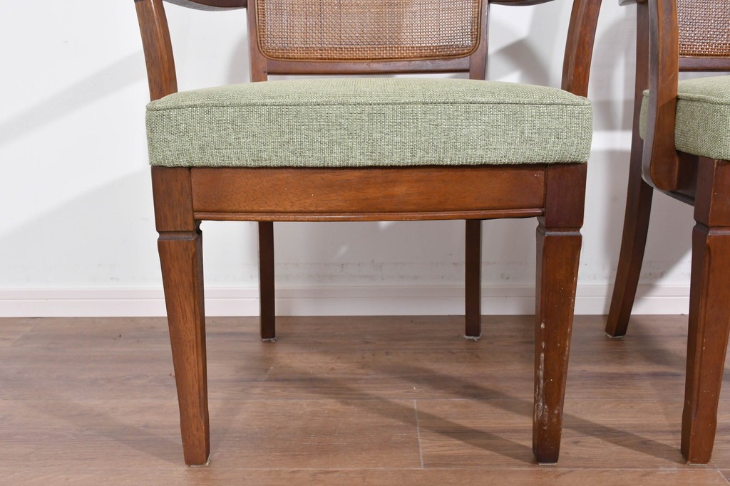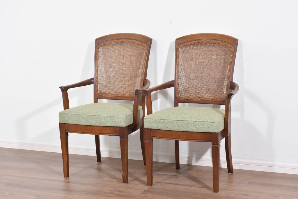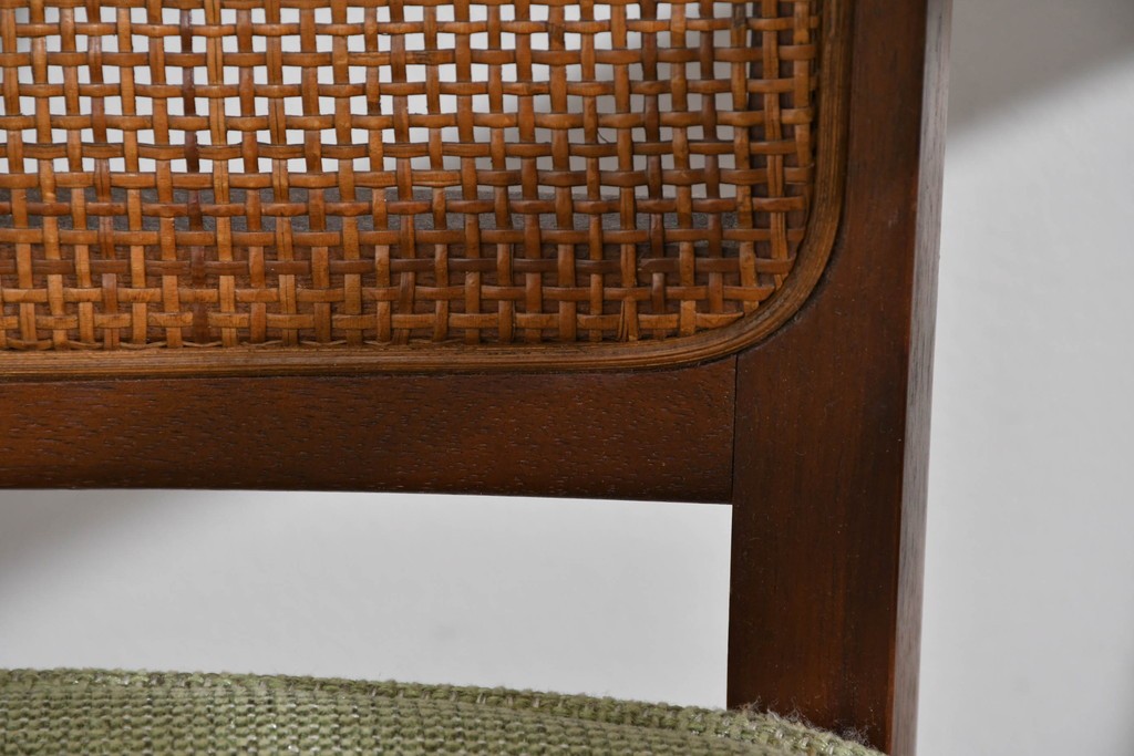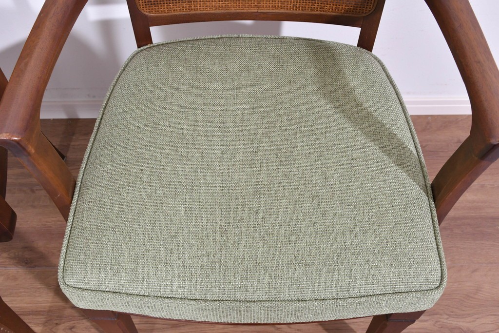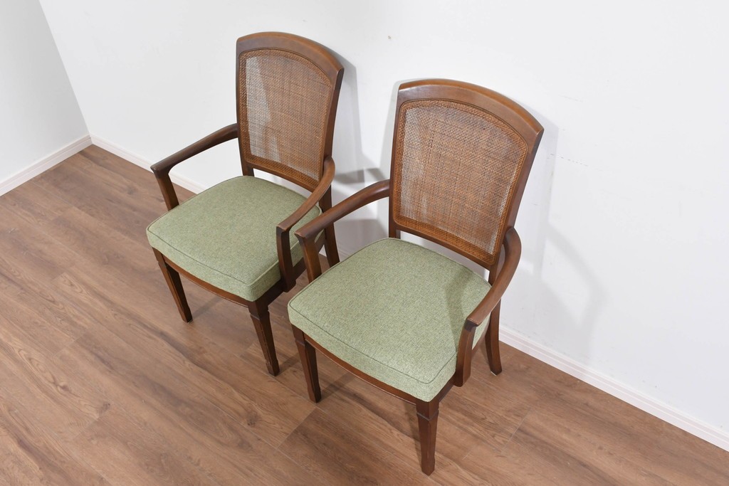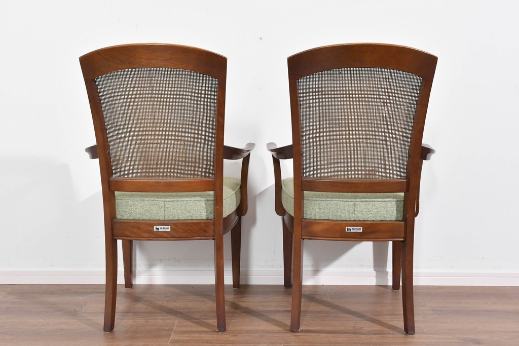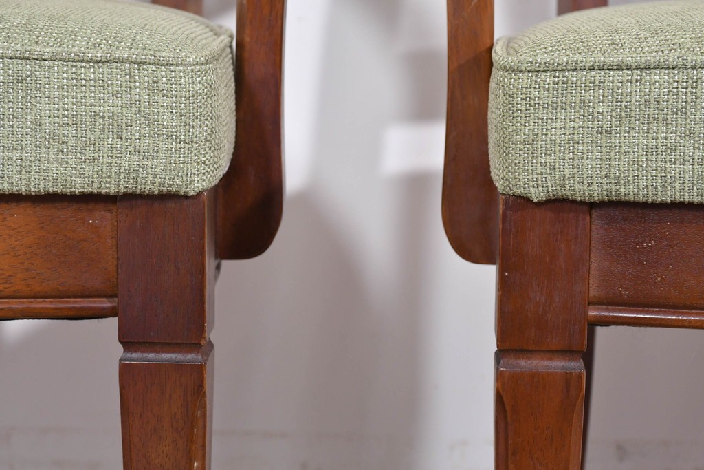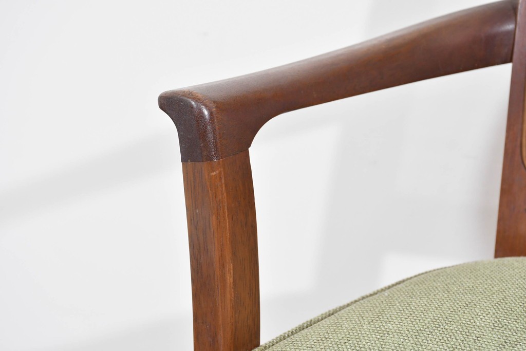 淡いグリーンの座面生地が木部の色合いと調和し、落ち着いた印象で空間に馴染みます。