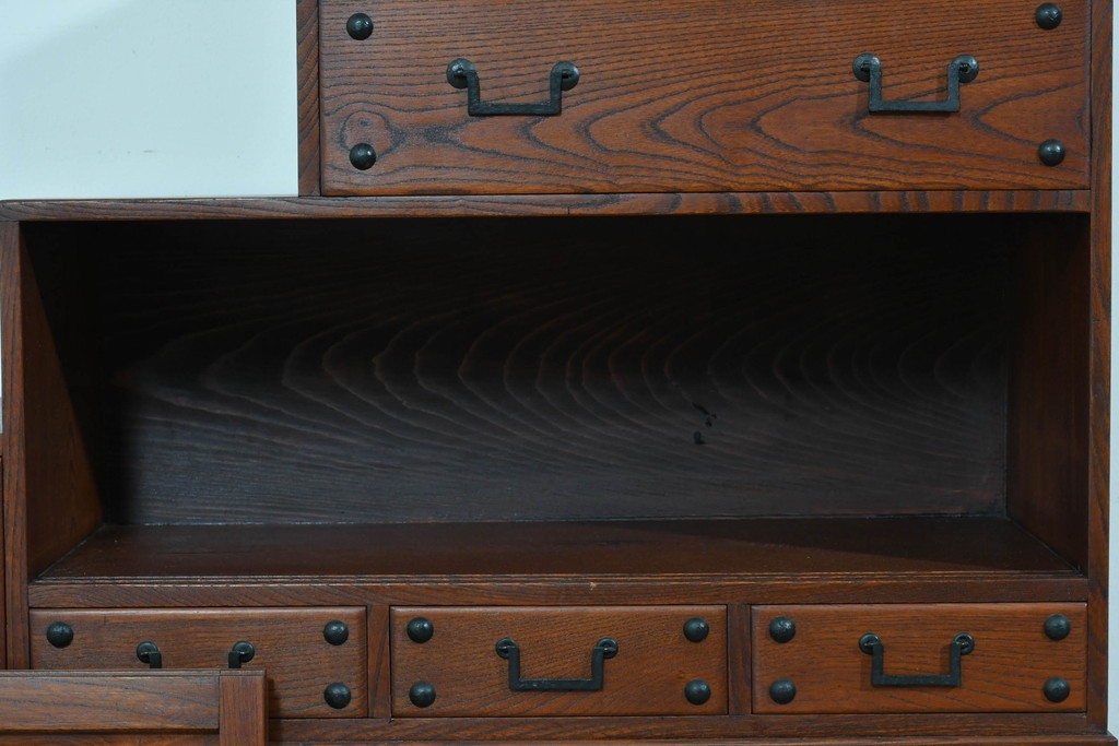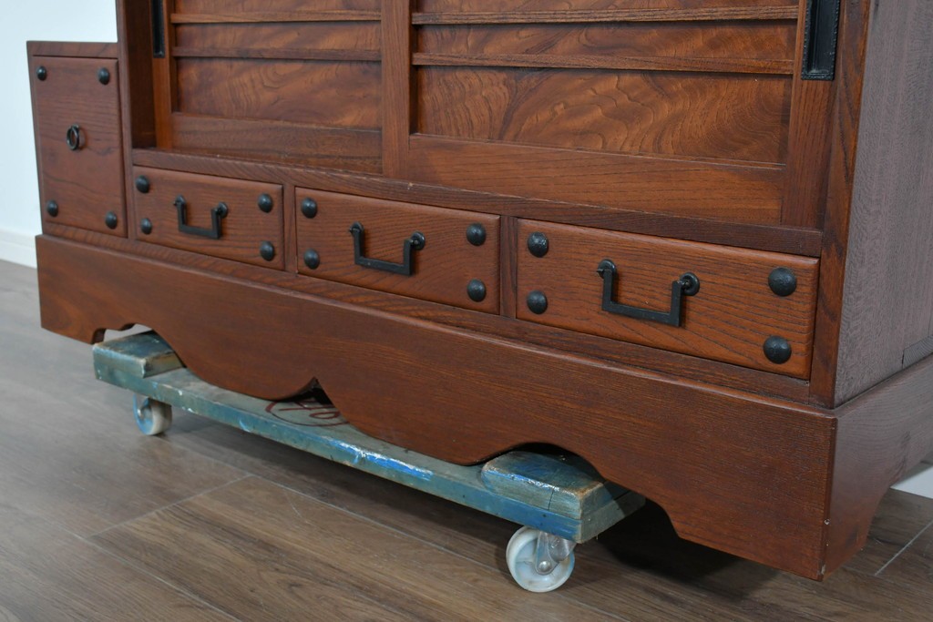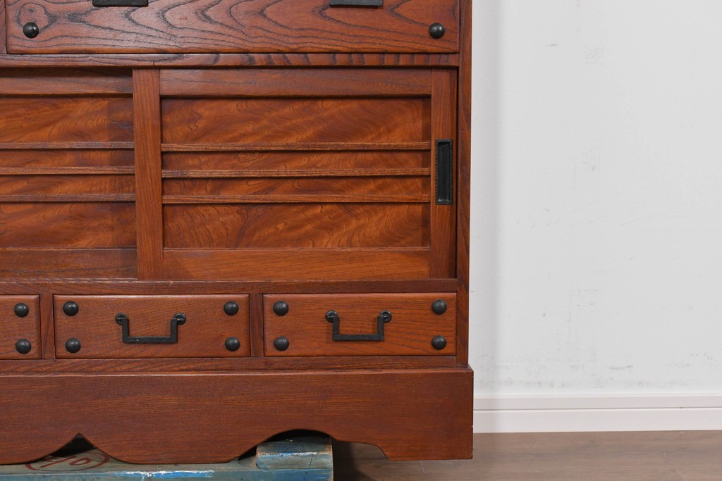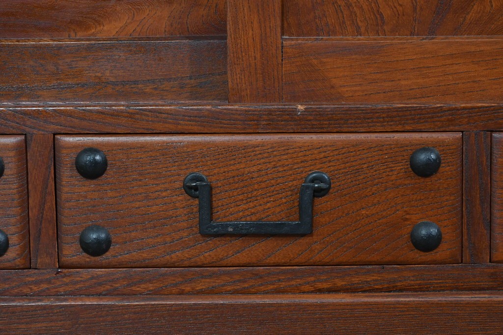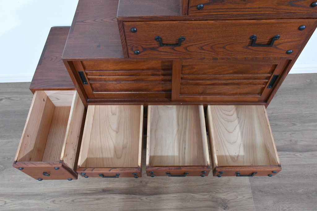 大小の抽斗と引き戸を組み合わせた前面は、黒金具の配置も相まってリズムよく整えられ、和モダンらしい落ち着いた表情を見せます。