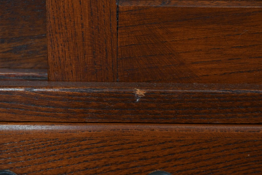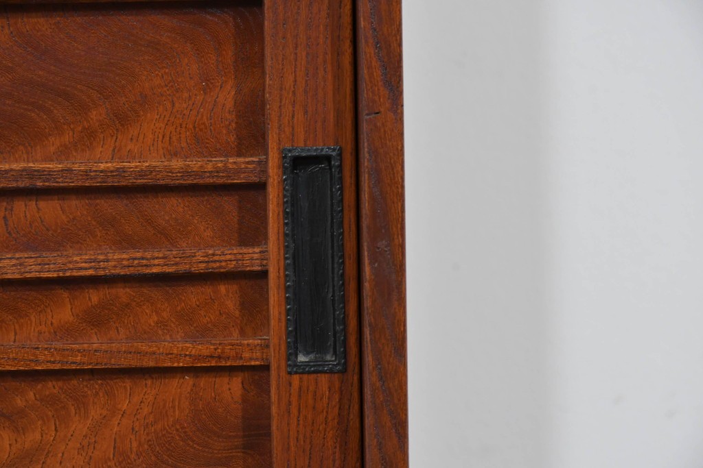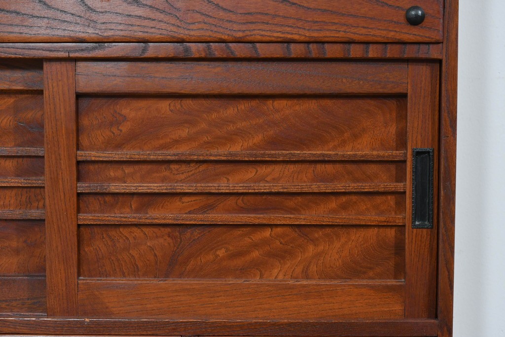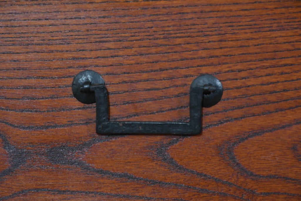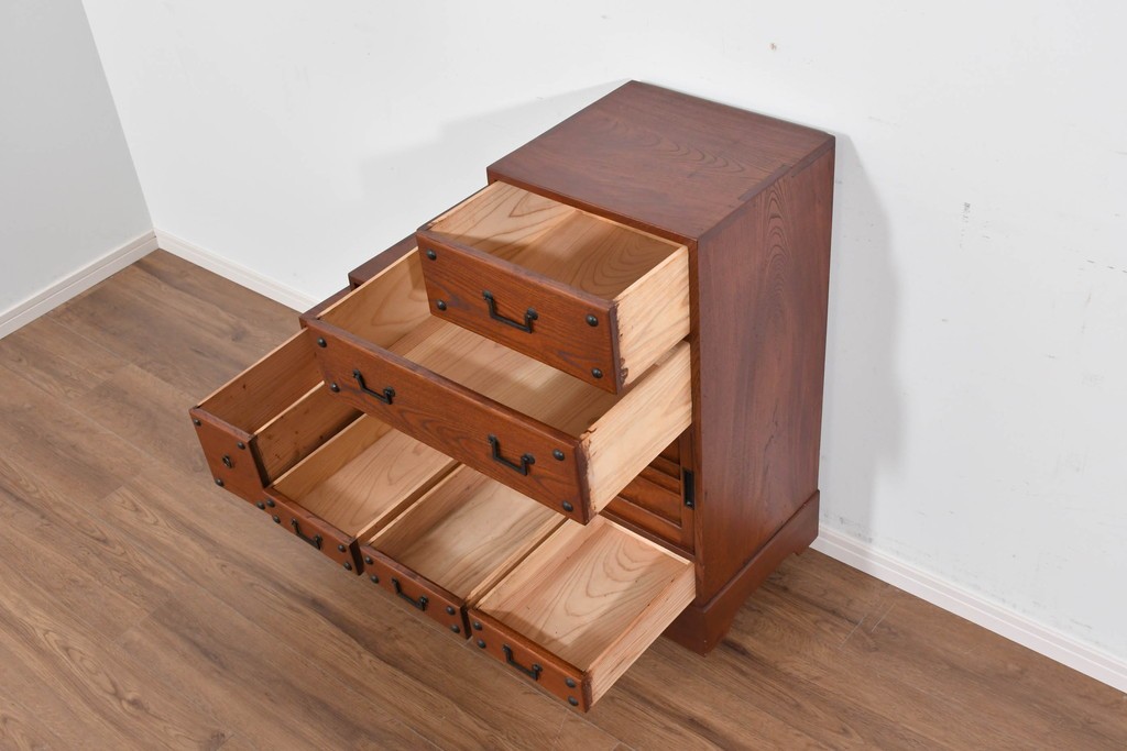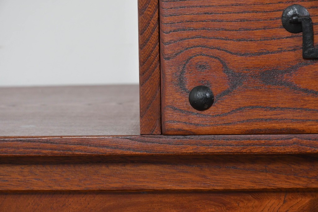 大小の抽斗と引き戸を組み合わせた前面は、黒金具の配置も相まってリズムよく整えられ、和モダンらしい落ち着いた表情を見せます。