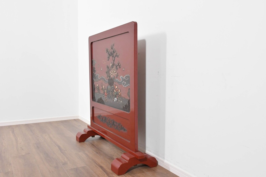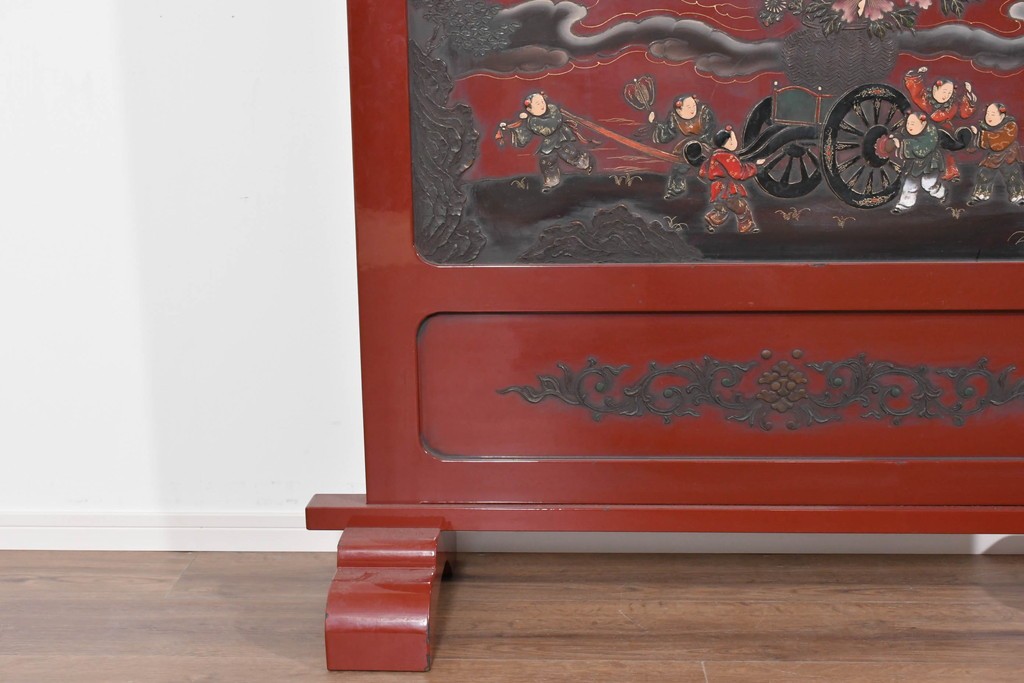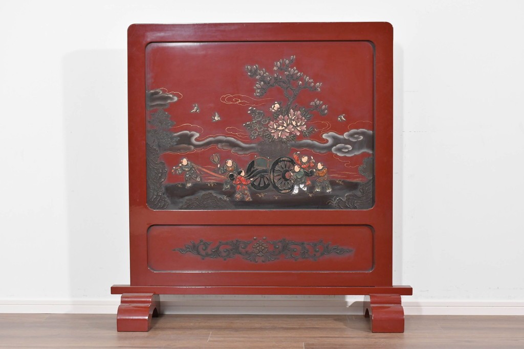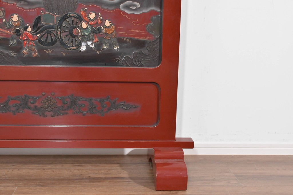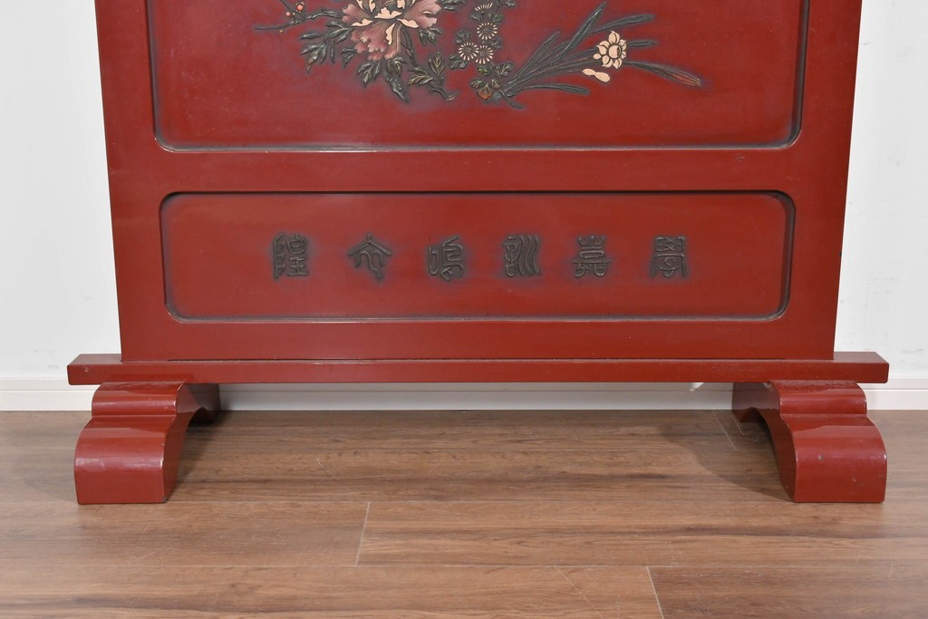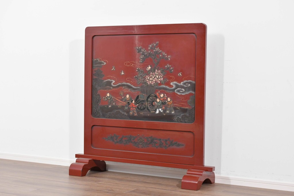 朱塗り漆の深い色調が目を引く、高級工芸品のアジアンヴィンテージ衝立です。