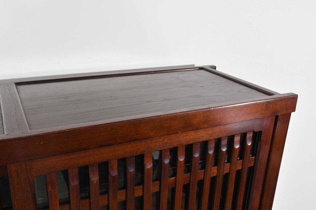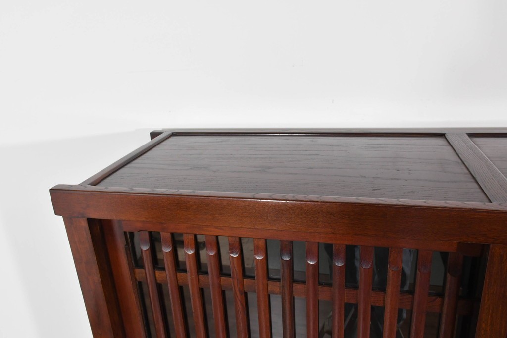 上下に設けられた格子戸はデザイン性と採光を兼ね備え、表情豊かな陰影を生み出します。内部には棚板が備わり、食器や日用品の収納に便利です。中央の引き出しは小物整理に適しており、暮らしの中で実用性を発揮します。