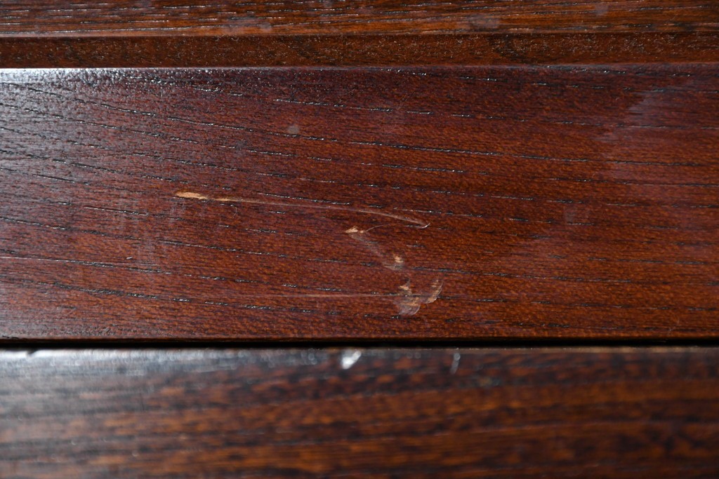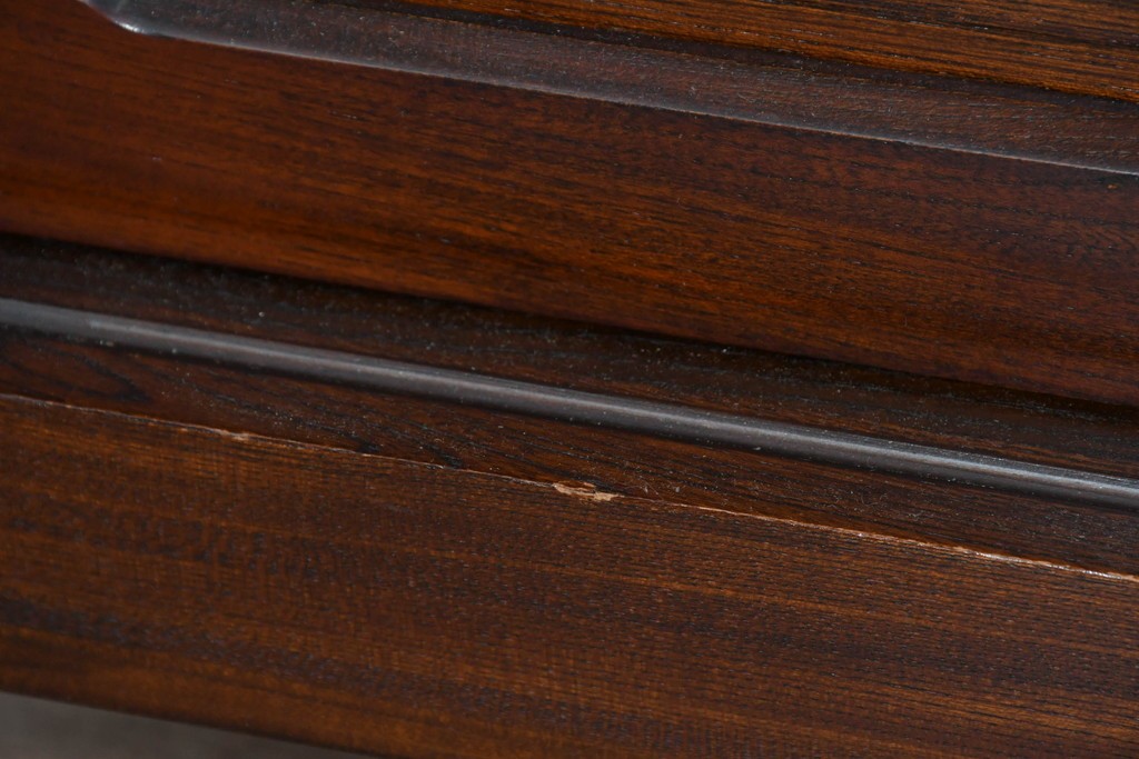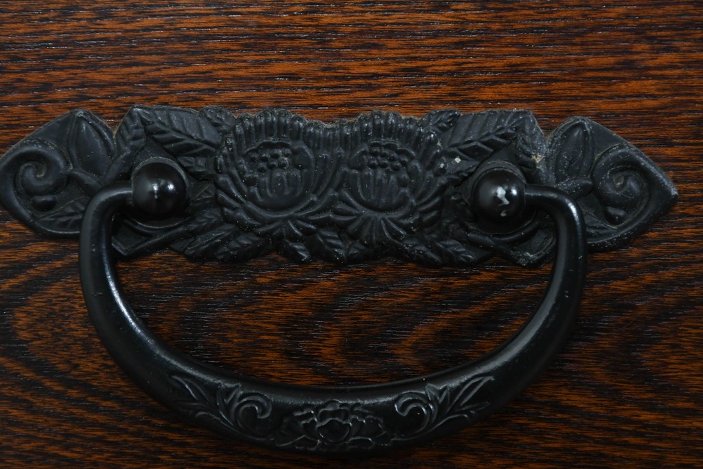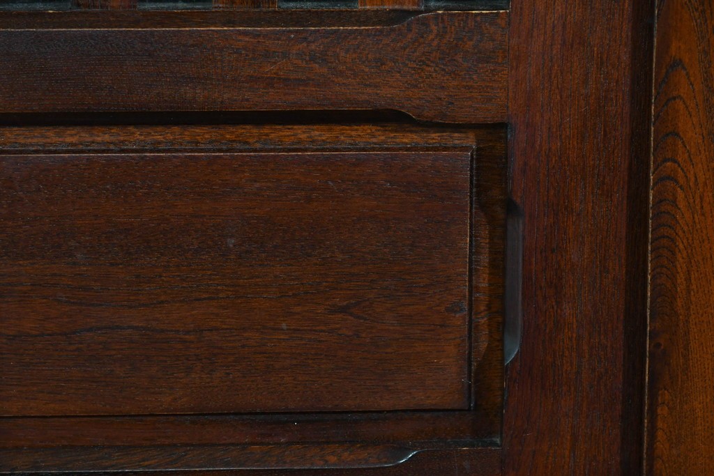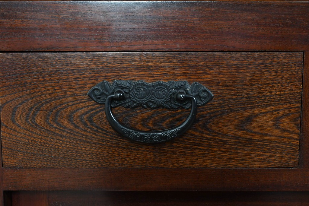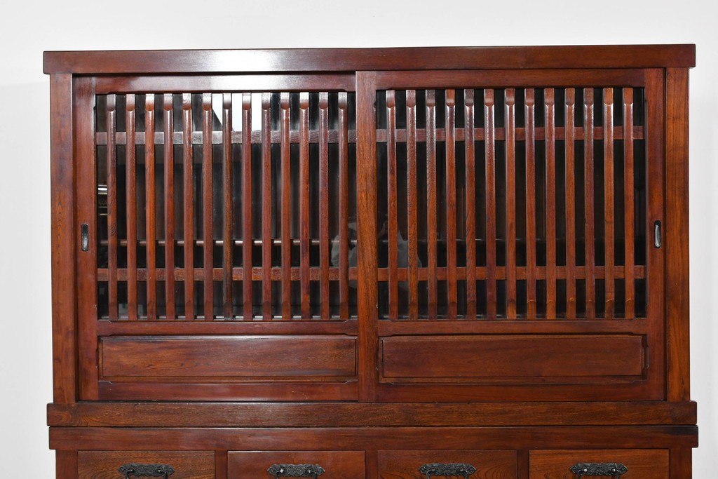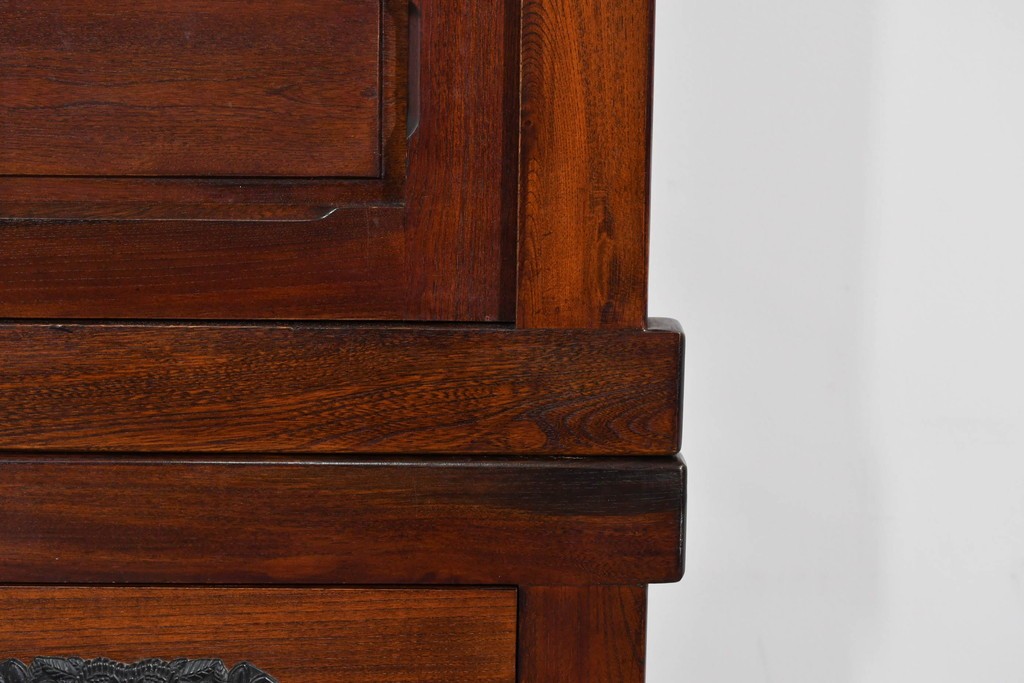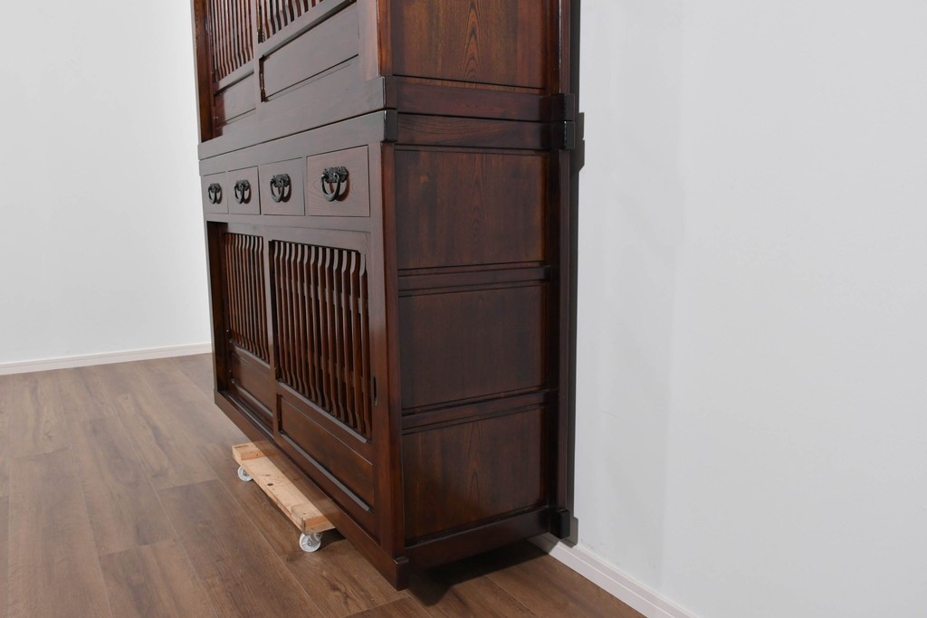 堅牢な框組みや鉄製取手の意匠など、和家具ならではの丁寧なつくりが随所に見られます。直線的で安定感のあるフォルムは、民芸家具の美しさを素直に伝えてくれます。現代の空間にも合わせやすく、インテリアの主役となる存在感があります。