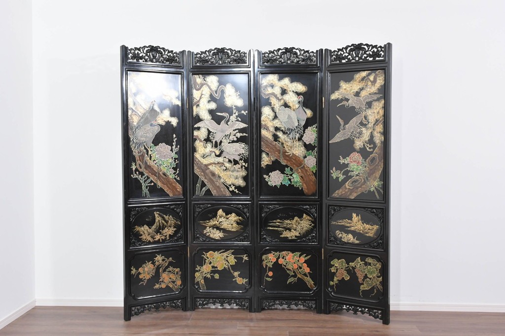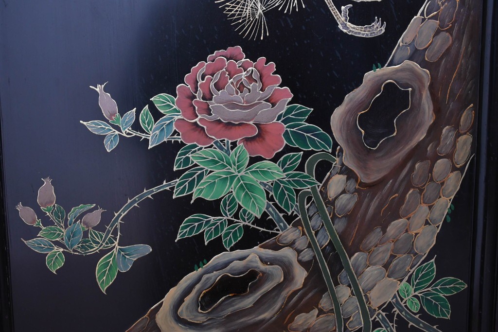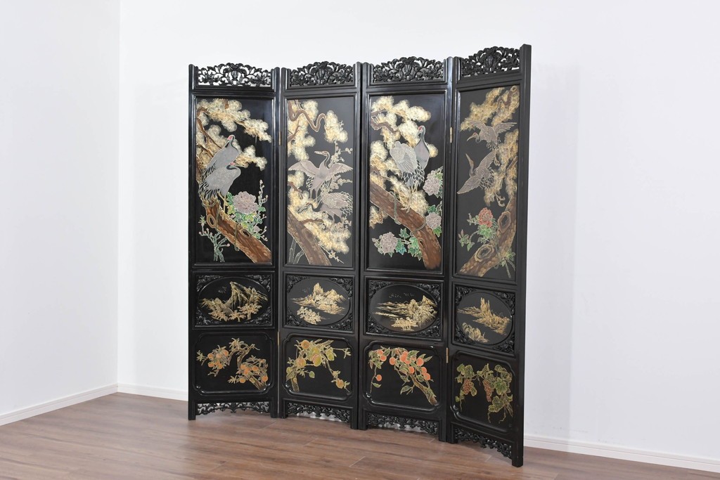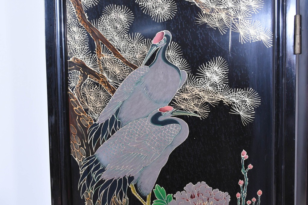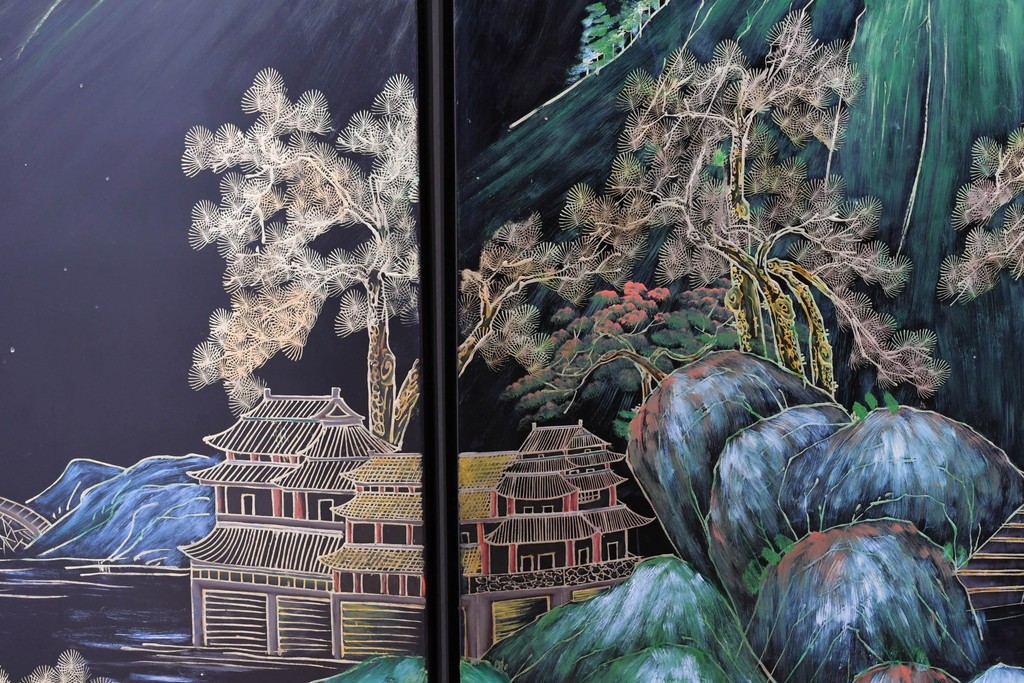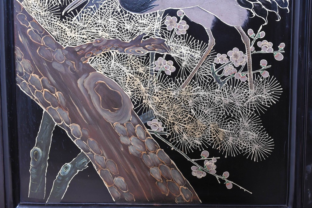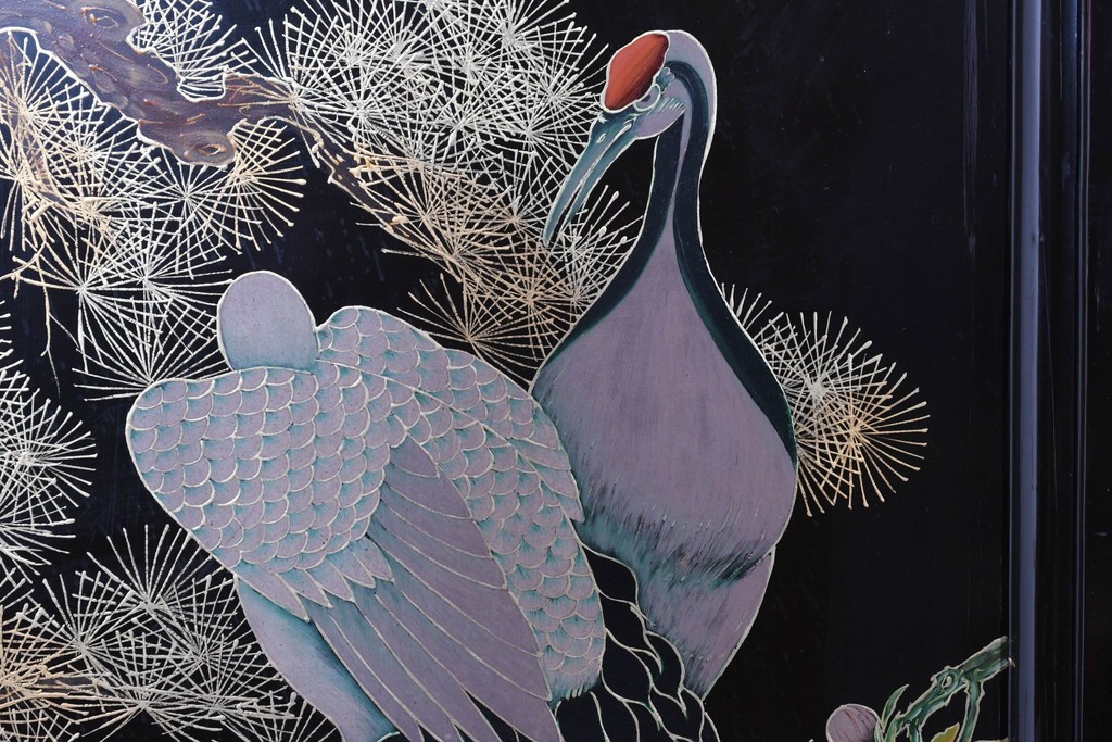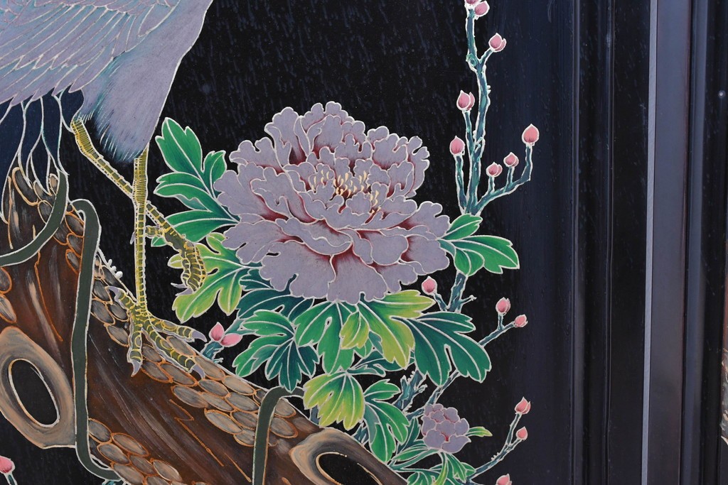 鶴や花々を描いた花鳥図、山並みや建物を描いた山水画が施され、オリエンタルな雰囲気を引き立てています。