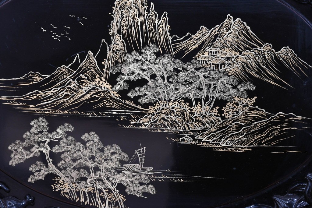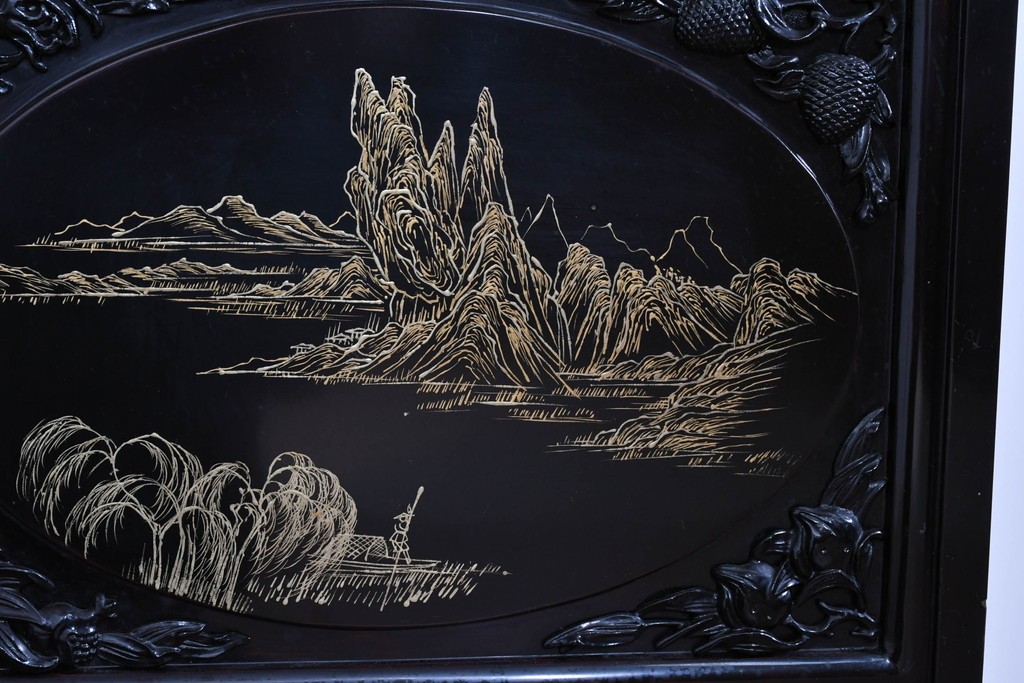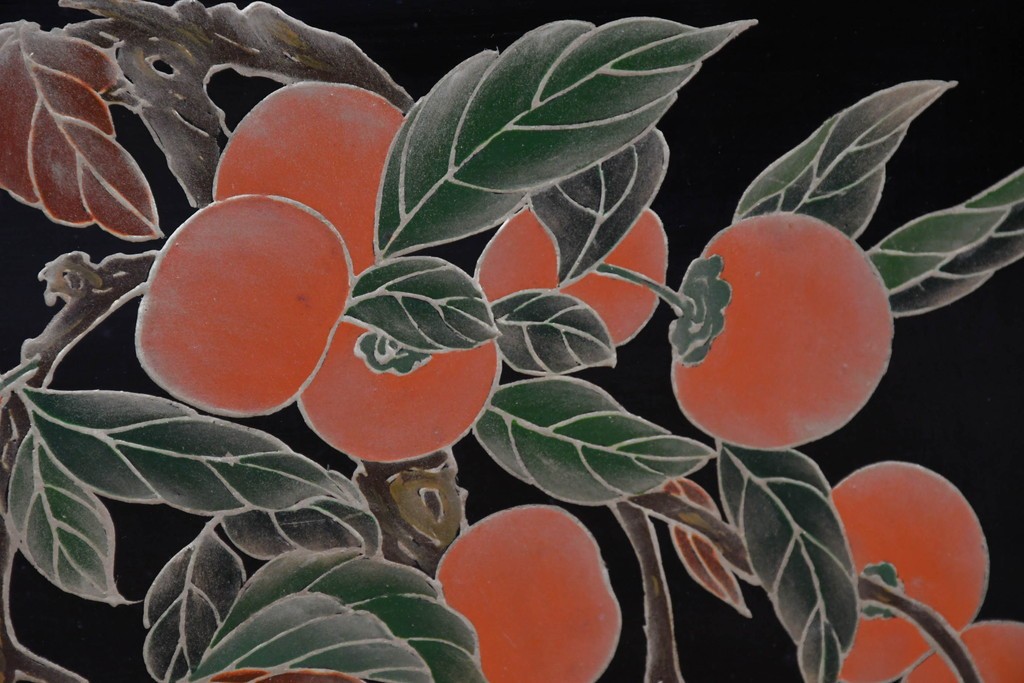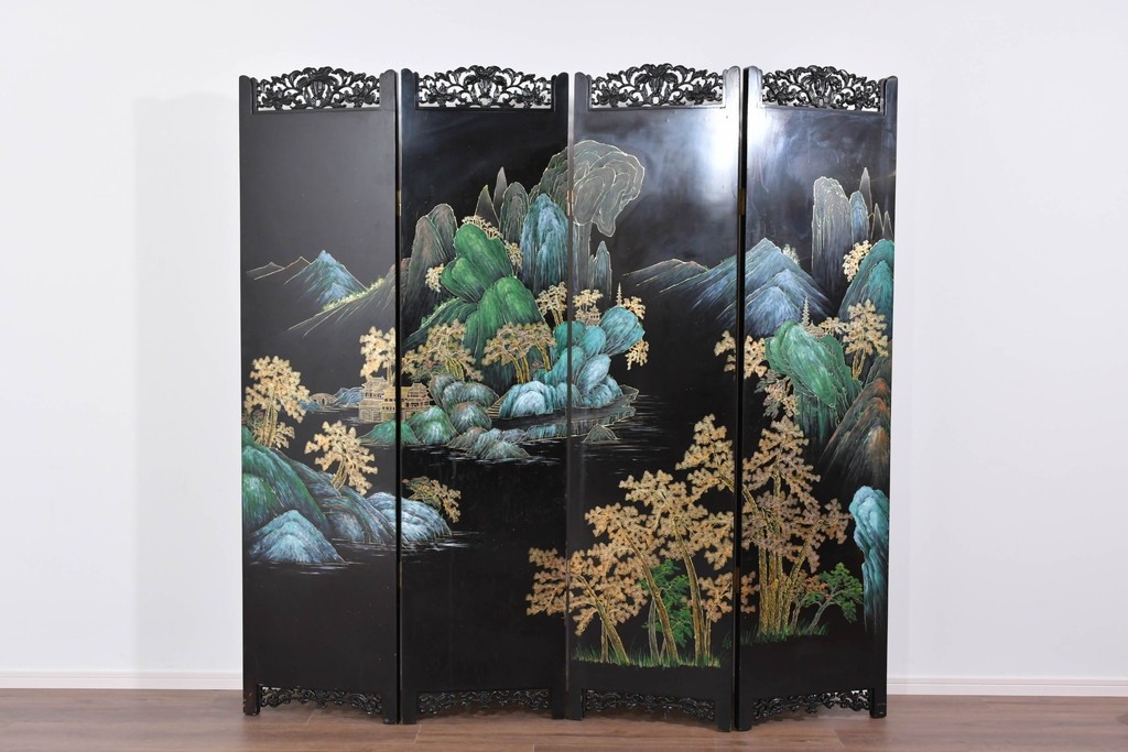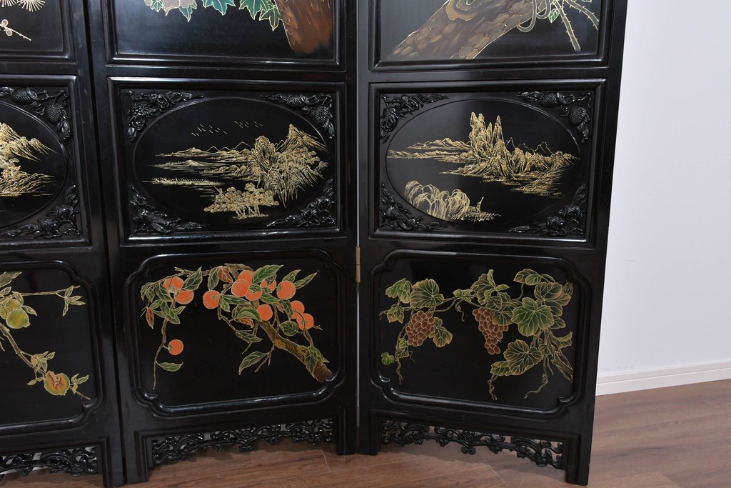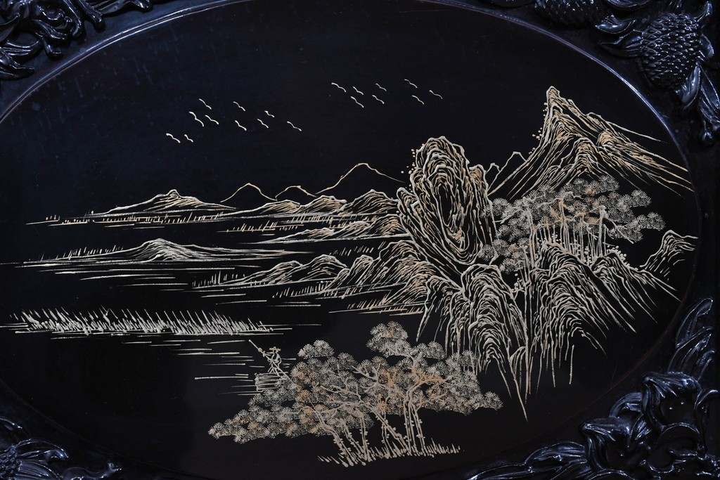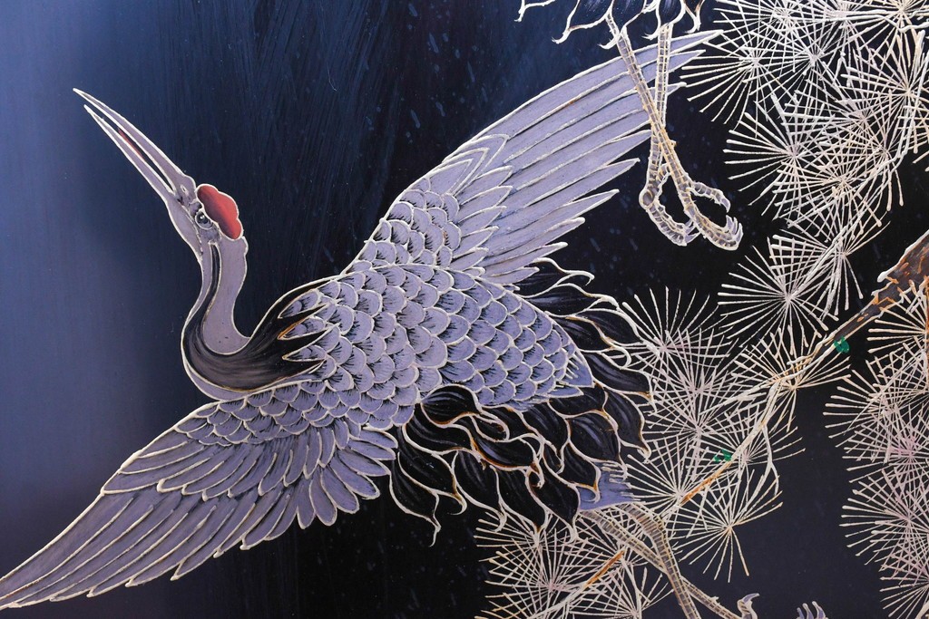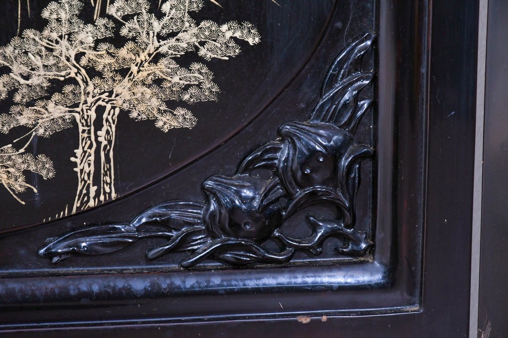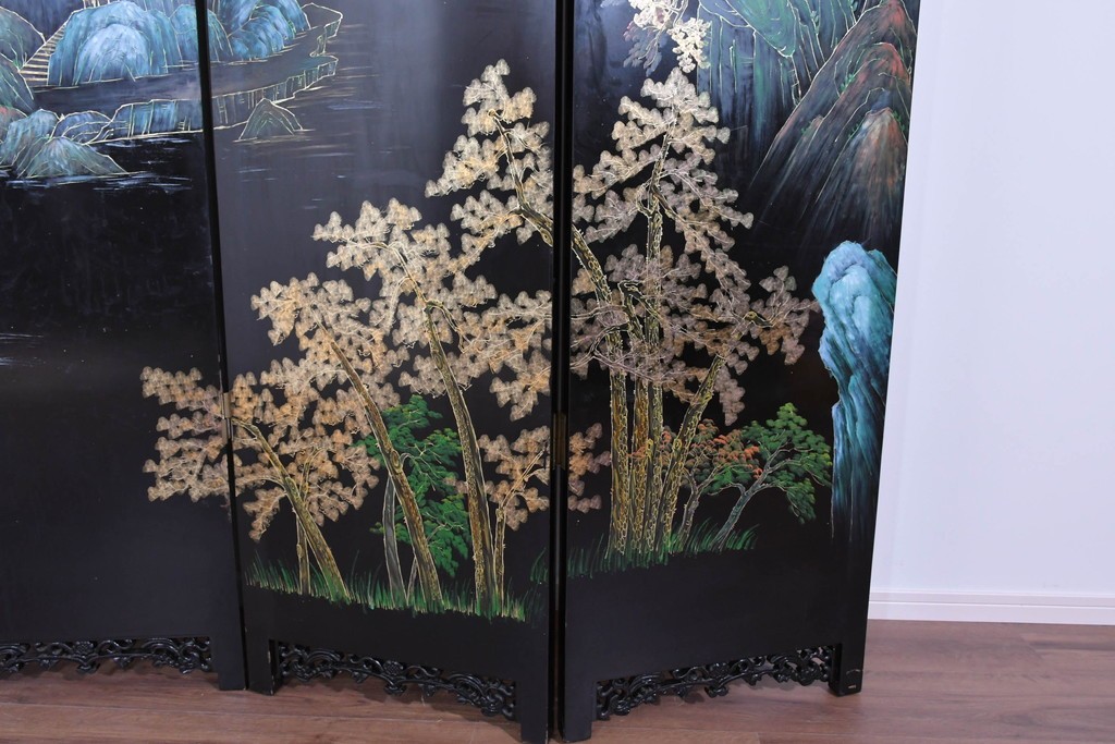 鶴や花々を描いた花鳥図、山並みや建物を描いた山水画が施され、オリエンタルな雰囲気を引き立てています。