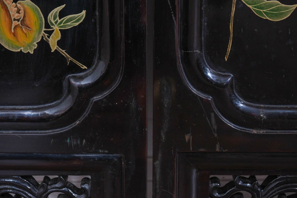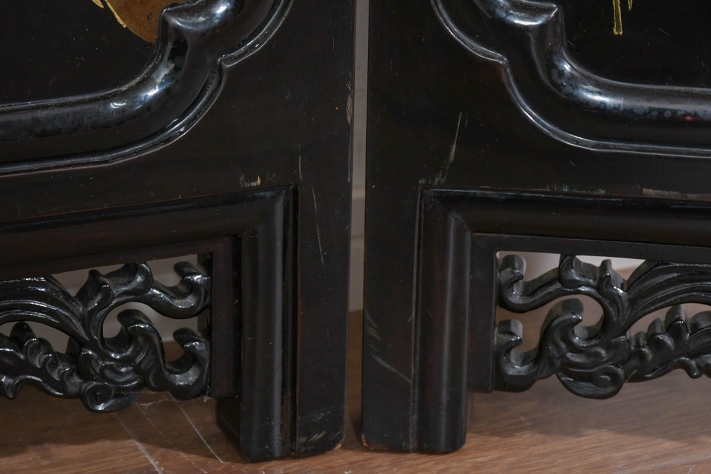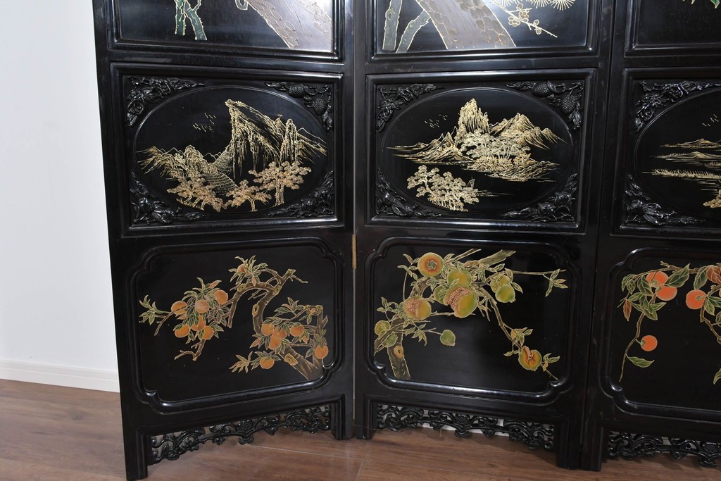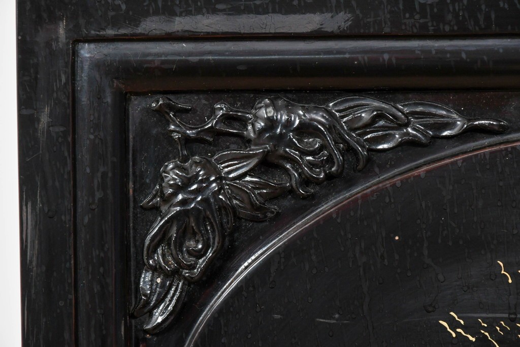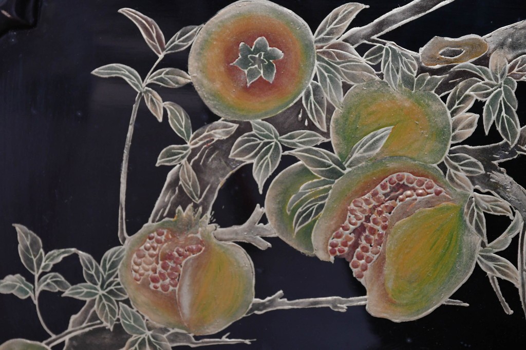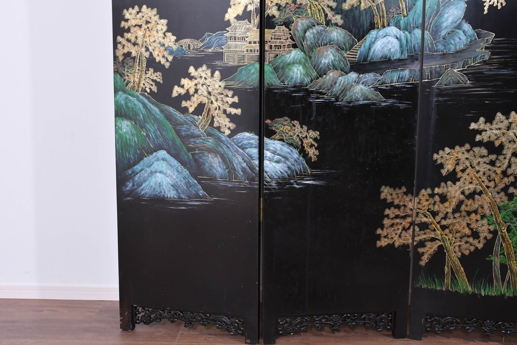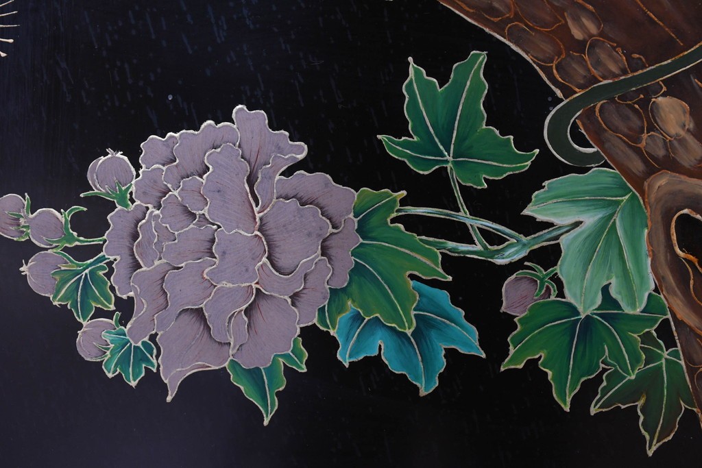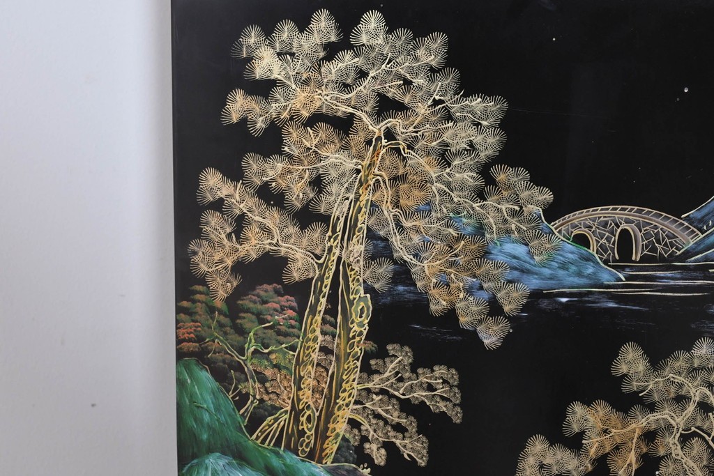 鶴や花々を描いた花鳥図、山並みや建物を描いた山水画が施され、オリエンタルな雰囲気を引き立てています。