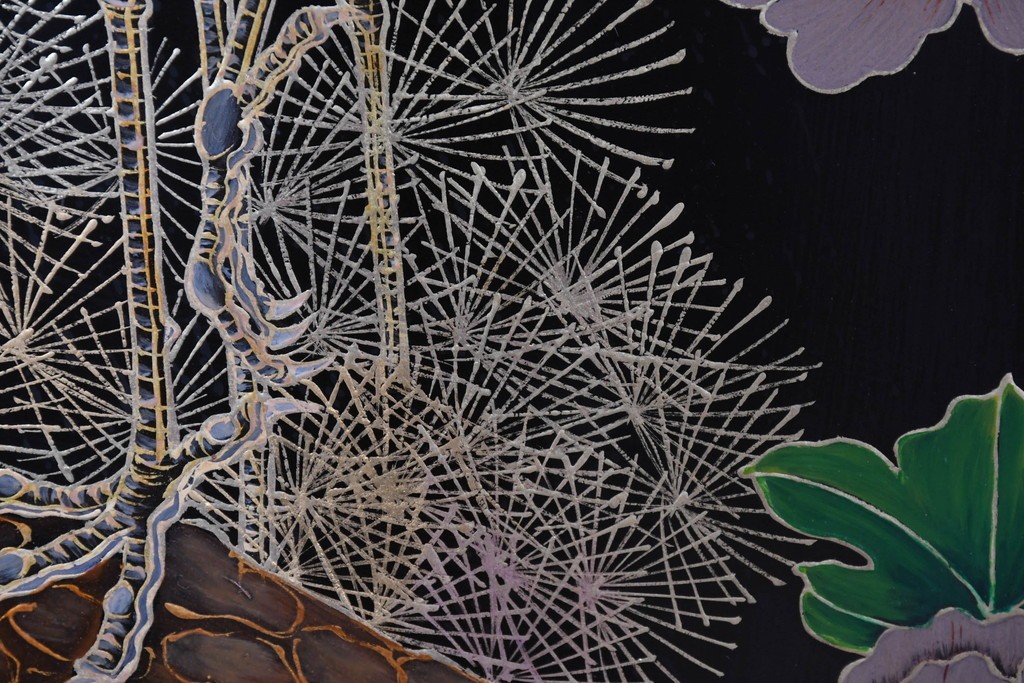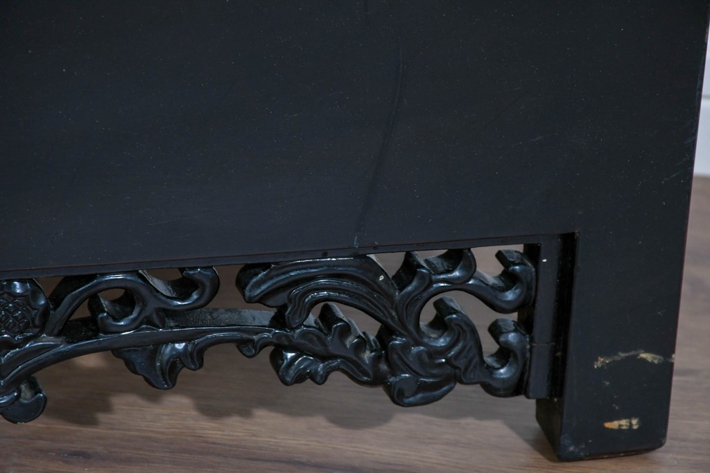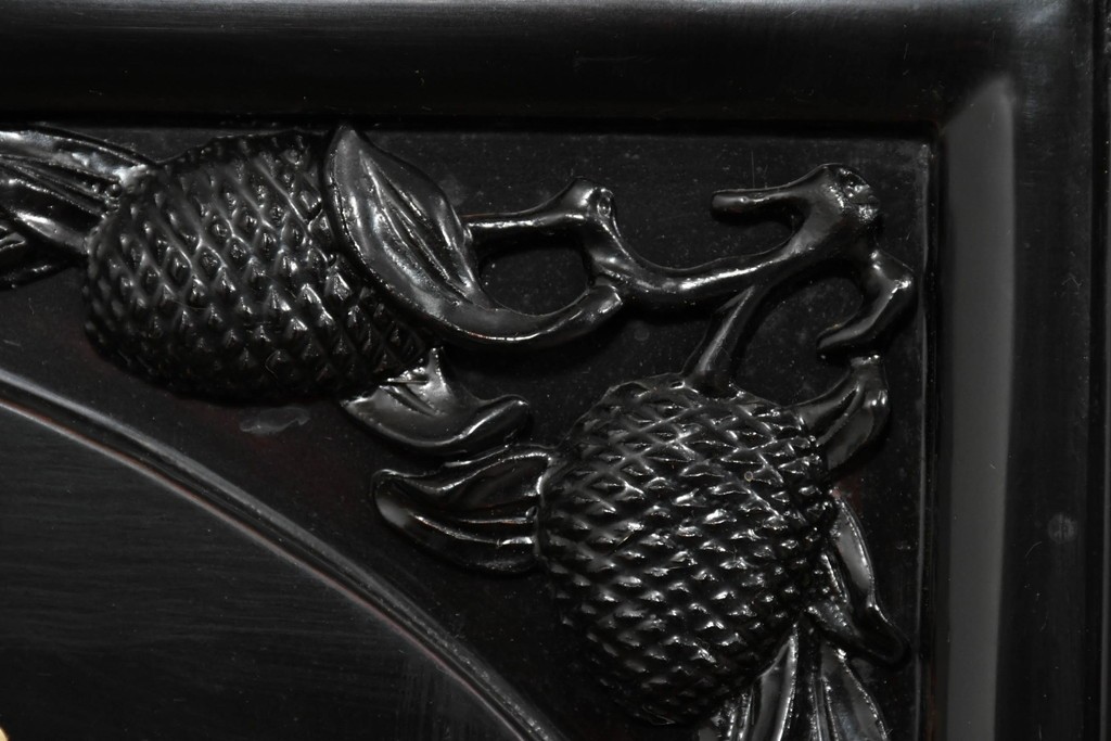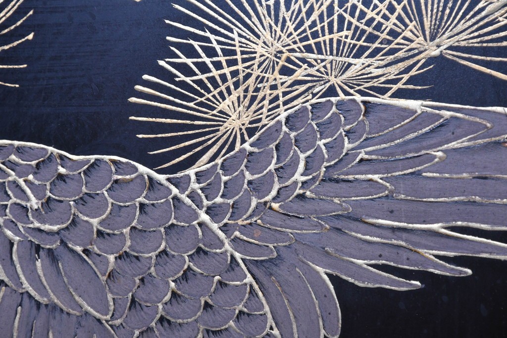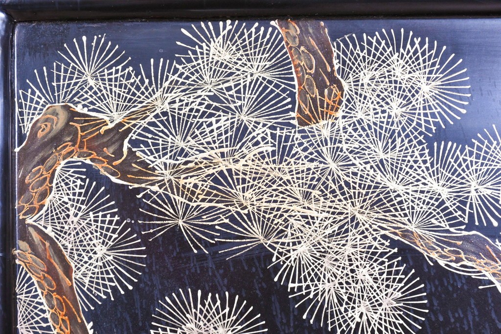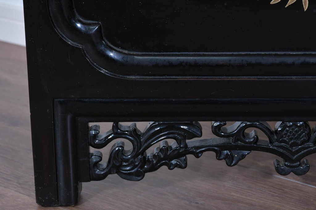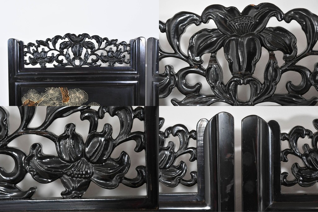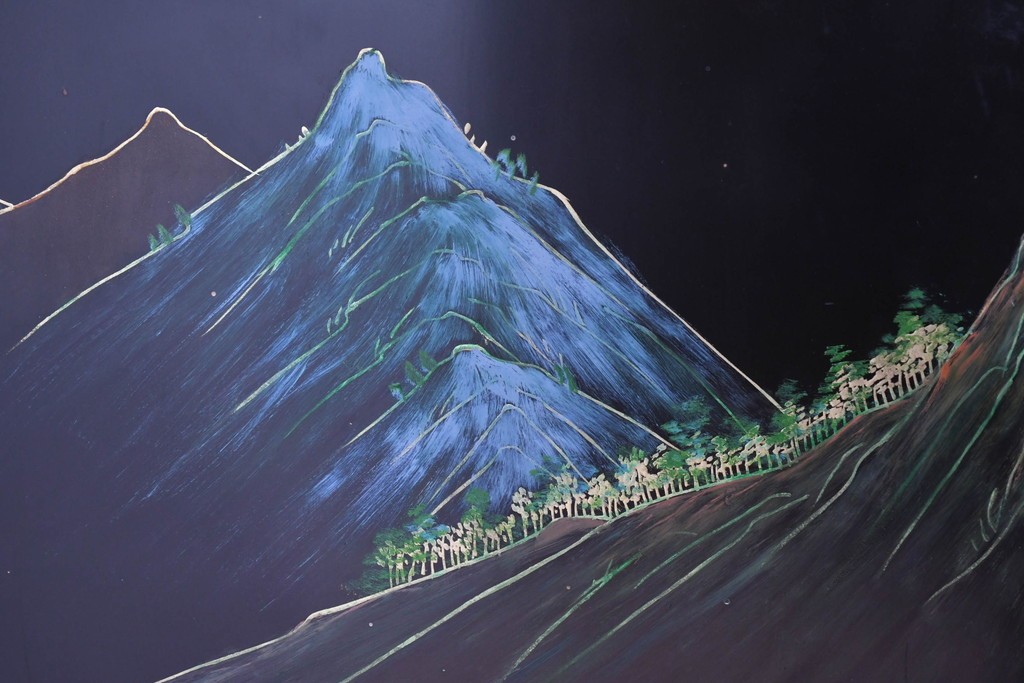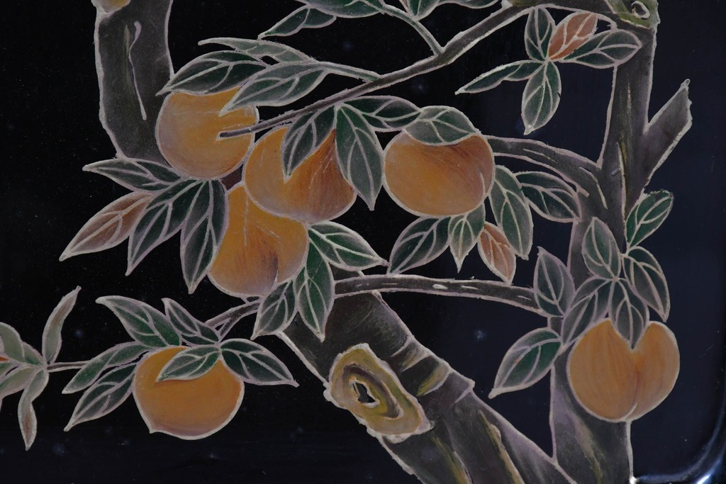 鶴や花々を描いた花鳥図、山並みや建物を描いた山水画が施され、オリエンタルな雰囲気を引き立てています。