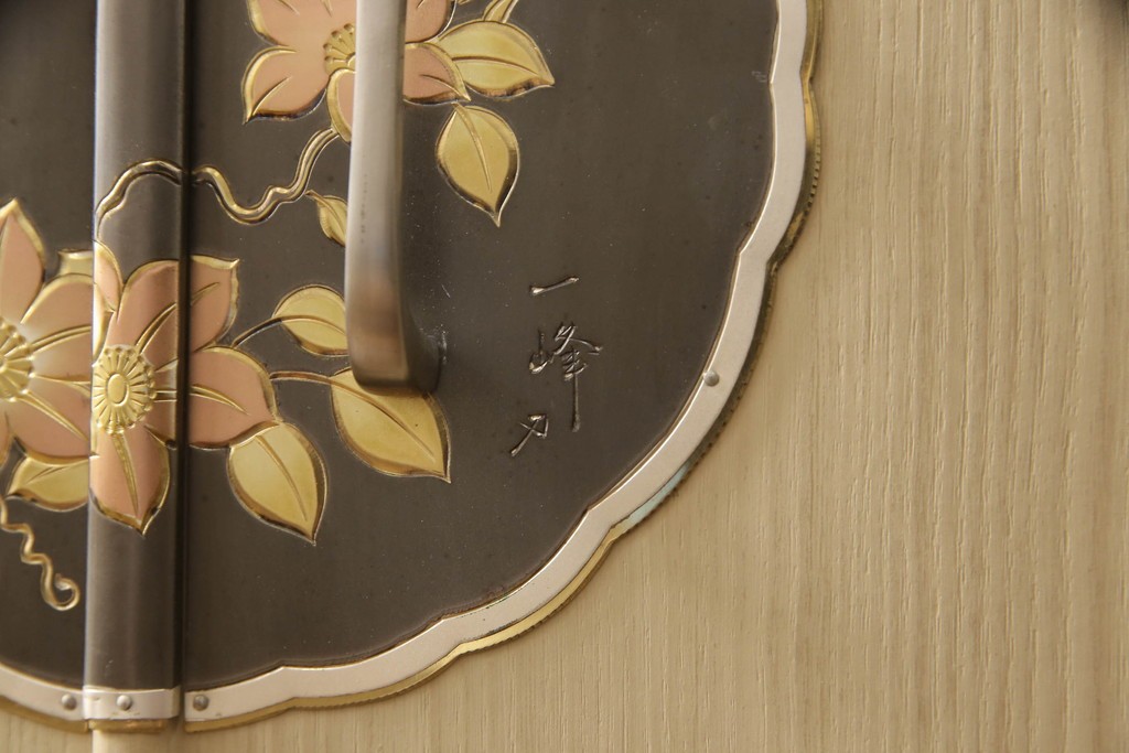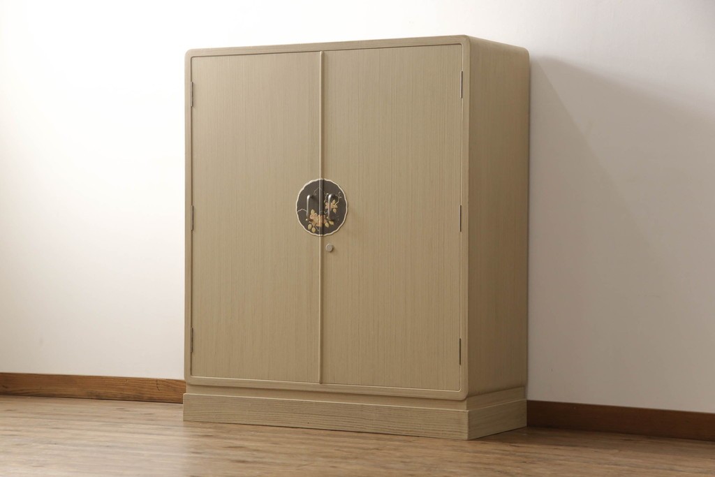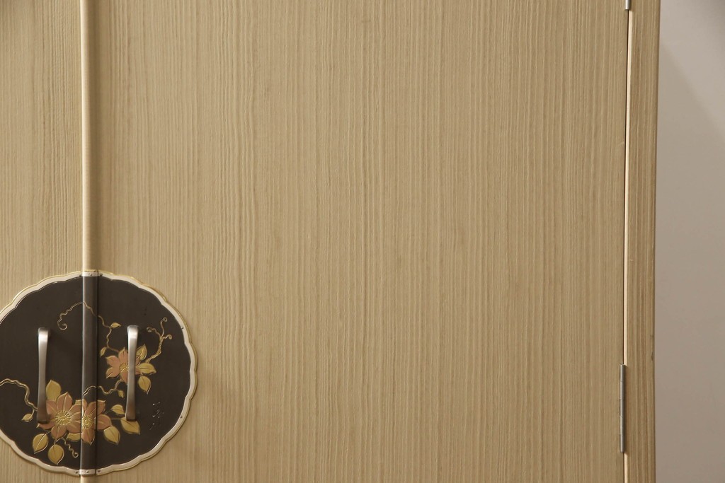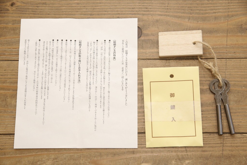 桐材ならではの柔らかな木肌と、前面に施された花文の金属装飾が上品な雰囲気を添えています。