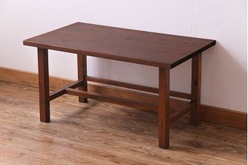 こちらは、和製アンティークのレトロな木製テーブルを取り入れたインテリア例。古家具らしい味わいが漂う温かなダイニングにコーディネートしました。ダイニングチェアやベンチ、食器棚などもアンティーク家具を使って、素朴でナチュラルな味わいを醸し出しています。