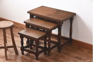木製脚のアンティークテーブルは、特に挽物加工された洋風の脚が人気。木材を回転させながら切削し、丸みを加えた立体感のある形状に仕上げられています。デコラティブでエレガントな雰囲気たっぷりの佇まいです。