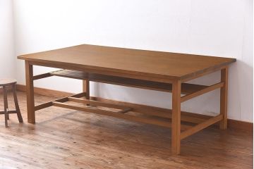アンティークダイニングテーブルは、昭和期頃に作られたもの。木目や節、古い傷、シミなどが素敵な味わいとなっていて、シンプルなデザインですが雰囲気は抜群です。天板はクリア塗装で仕上げているので、毎日気兼ねなく水拭きでお手入れできるのもうれしいポイントですよ。