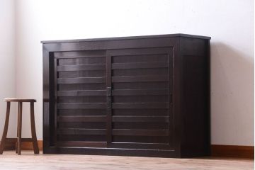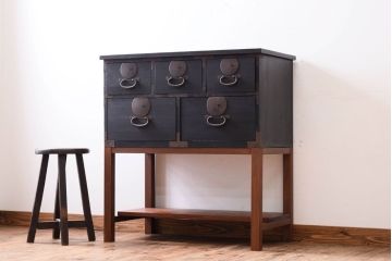こちらは、和製アンティークのレトロな木製テーブルを取り入れたインテリア例。古家具らしい味わいが漂う温かなダイニングにコーディネートしました。ダイニングチェアやベンチ、食器棚などもアンティーク家具を使って、素朴でナチュラルな味わいを醸し出しています。