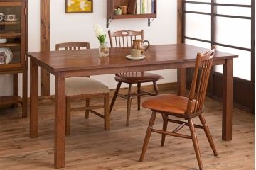 こちらは、和製アンティークのレトロな木製テーブルを取り入れたインテリア例。古家具らしい味わいが漂う温かなダイニングにコーディネートしました。ダイニングチェアやベンチ、食器棚などもアンティーク家具を使って、素朴でナチュラルな味わいを醸し出しています。