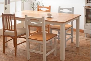 アーコールのダイニングセットは、シンプルなアンティークスタイルが好きな方に大人気のアイテム。余分な装飾のないベーシックで美しいデザインで、木製家具らしい温かみもあり、幅広い空間に自然と馴染みます。ダイニングテーブルは、天板の両端を折りたためるバタフライテーブルです。使わない時はコンパクトにしたり、片方だけ折って壁付けで使用したりもできますよ。