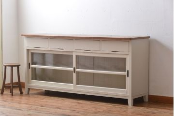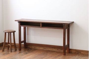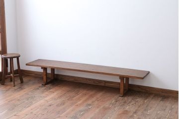 こちらは、和製アンティークのレトロな木製テーブルを取り入れたインテリア例。古家具らしい味わいが漂う温かなダイニングにコーディネートしました。ダイニングチェアやベンチ、食器棚などもアンティーク家具を使って、素朴でナチュラルな味わいを醸し出しています。