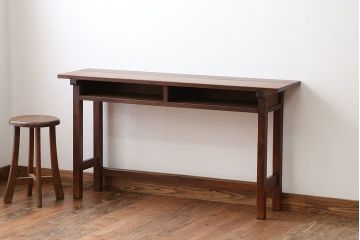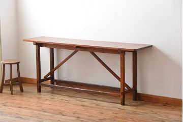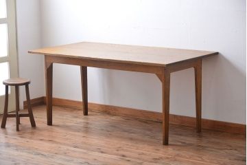 アンティークダイニングテーブルは、昭和期頃に作られたもの。木目や節、古い傷、シミなどが素敵な味わいとなっていて、シンプルなデザインですが雰囲気は抜群です。天板はクリア塗装で仕上げているので、毎日気兼ねなく水拭きでお手入れできるのもうれしいポイントですよ。