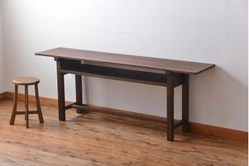 こちらは、和製アンティークのレトロな木製テーブルを取り入れたインテリア例。古家具らしい味わいが漂う温かなダイニングにコーディネートしました。ダイニングチェアやベンチ、食器棚などもアンティーク家具を使って、素朴でナチュラルな味わいを醸し出しています。