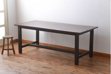 アンティークダイニングテーブルは、昭和期頃に作られたもの。木目や節、古い傷、シミなどが素敵な味わいとなっていて、シンプルなデザインですが雰囲気は抜群です。天板はクリア塗装で仕上げているので、毎日気兼ねなく水拭きでお手入れできるのもうれしいポイントですよ。