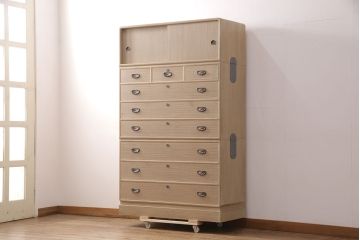衣類の中でも特に着物を収納する箪笥・和風家具・和家具をお探しの方も多いかと思います。着物収納の定番は衣類収納と同じく「衣装箪笥」ですが、その中でも特に注目したいのが衣裳盆付きのもの。通常の引き出しと異なり着物の出し入れがよりスムーズでしわなども発生しにくくとても便利です。また当店オリジナルの衣裳盆が棚板に変えられるオリジナルのリメイク品なら、万が一着物を着ない生活にライフスタイルが変わっても末長く使えて安心です。