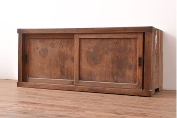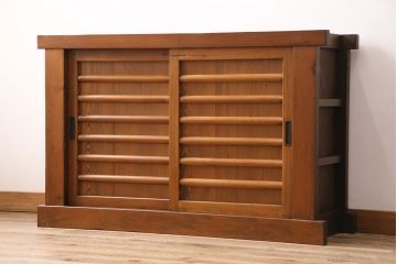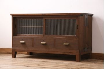 キッチンに取り入れる箪笥・和風家具・和家具には、食器類や食品類を入れることが多いと思います。この時まず考えておきたいのが中のものは隠せたほうがいいのか、それとも見せられたほうがいいのかということ。 中を隠したい場合は木製引き戸のついた和家具がまず候補に挙がってきます。この時使いやすいのがなんと言っても「水屋箪笥」。台所用に作られただけあって、キッチンのあれこれを快適に収納することができます。水屋箪笥は本来大型のものが多いですが、スペースが限られている場合は「水屋箪笥ローボード」が便利です。こちらは当店で水屋箪笥をコンパクトにリメイクしたお品。高さが低い分、圧迫感が減りキッチンを広く見せてくれる効果が期待できますよ。
