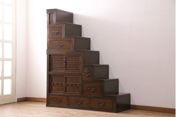 階段が箪笥になった階段箪笥タイプの和風家具・和家具は、その見栄えするデザインから和のデザインが気になる方にはあこがれの存在。こちらも関西で主に発展したアイテムで、限られた住居空間を生かす町人のアイディアが詰まっています。壁際に置くだけでなく空間の中心でパーテーション(間仕切り)感覚で使ってみるのも素敵ですよ。