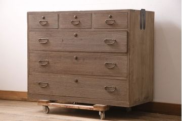 車輪が付いた車箪笥タイプの和風家具・和家具は転がして移動できると昔は重宝されてたアイテム。商品在庫や家財道具などを入れて活用していたそうです。車輪のおかげで高さが出る分、脚付きのようなモダンな雰囲気がするのが面白いところ。さらに金具も控えめなので現代的なお部屋にも馴染みやすく人気の高いアイテムです。