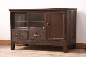 キッチンに取り入れる箪笥・和風家具・和家具には、食器類や食品類を入れることが多いと思います。この時まず考えておきたいのが中のものは隠せたほうがいいのか、それとも見せられたほうがいいのかということ。 中を隠したい場合は木製引き戸のついた和家具がまず候補に挙がってきます。この時使いやすいのがなんと言っても「水屋箪笥」。台所用に作られただけあって、キッチンのあれこれを快適に収納することができます。水屋箪笥は本来大型のものが多いですが、スペースが限られている場合は「水屋箪笥ローボード」が便利です。こちらは当店で水屋箪笥をコンパクトにリメイクしたお品。高さが低い分、圧迫感が減りキッチンを広く見せてくれる効果が期待できますよ。