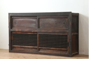 キッチンに取り入れる箪笥・和風家具・和家具には、食器類や食品類を入れることが多いと思います。この時まず考えておきたいのが中のものは隠せたほうがいいのか、それとも見せられたほうがいいのかということ。 中を隠したい場合は木製引き戸のついた和家具がまず候補に挙がってきます。この時使いやすいのがなんと言っても「水屋箪笥」。台所用に作られただけあって、キッチンのあれこれを快適に収納することができます。水屋箪笥は本来大型のものが多いですが、スペースが限られている場合は「水屋箪笥ローボード」が便利です。こちらは当店で水屋箪笥をコンパクトにリメイクしたお品。高さが低い分、圧迫感が減りキッチンを広く見せてくれる効果が期待できますよ。