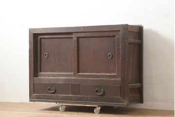 車輪が付いた車箪笥タイプの和風家具・和家具は転がして移動できると昔は重宝されてたアイテム。商品在庫や家財道具などを入れて活用していたそうです。車輪のおかげで高さが出る分、脚付きのようなモダンな雰囲気がするのが面白いところ。さらに金具も控えめなので現代的なお部屋にも馴染みやすく人気の高いアイテムです。
