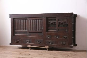 キッチンに取り入れる箪笥・和風家具・和家具には、食器類や食品類を入れることが多いと思います。この時まず考えておきたいのが中のものは隠せたほうがいいのか、それとも見せられたほうがいいのかということ。 中を隠したい場合は木製引き戸のついた和家具がまず候補に挙がってきます。この時使いやすいのがなんと言っても「水屋箪笥」。台所用に作られただけあって、キッチンのあれこれを快適に収納することができます。水屋箪笥は本来大型のものが多いですが、スペースが限られている場合は「水屋箪笥ローボード」が便利です。こちらは当店で水屋箪笥をコンパクトにリメイクしたお品。高さが低い分、圧迫感が減りキッチンを広く見せてくれる効果が期待できますよ。