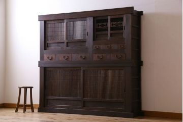 台所用家具であった水屋箪笥タイプの和風家具・和家具は、食器や食物を入れるための作りが特徴。滋賀や京都など関西で発展が著しく、現代でも関西水屋は上質な品として認知されています。立派な作りのものが多いのは、台所に豪華な水屋を置くことが富の象徴とされていたからだそう。堂々たる存在感は店舗什器にもおすすめです。