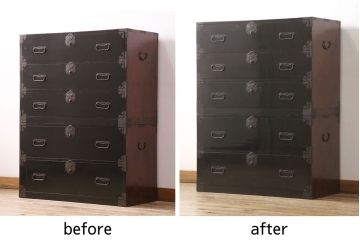 木地呂塗りの手法で漆を塗った箪笥・和風家具・和家具は艶々として、鏡面仕上げのよう。何度も漆を重ね最後に磨きをかけようやく完成する手間のかかる技法です。木目が漆の底に沈んでいるようにかすかに見える様子は幻想的でもあります。重厚な金具との組み合わせは高級感たっぷり。お部屋の主役級家具として活躍します。