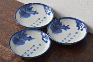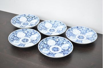 また、印判皿は染付皿と同じく、伝統的な文様が描かれていますが、職人が丁寧に絵付けした器と比べると、より色や濃さが均一で味気なく感じるかもしれません。ですが、素朴で親しみを感じるレトロな絵柄や、転写もの特有の擦れやズレなどは、印判皿ならではの味わい。希少性が低いことがから価格がお手頃なこともあって、日常使いのちょっとしたアンティーク和食器がほしい方から人気を集めています。
