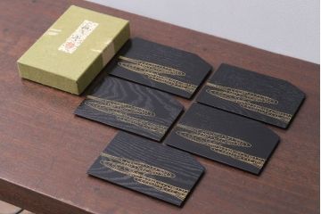 長寿のシンボルとされる鶴亀。松竹梅と並んでよく知られる縁起物の文様。特に漆器の加飾に頻繁に登場する。