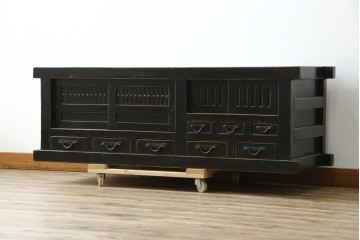 ▲ こちらは、重ね水屋箪笥の上段をサイドボードにリメイクした例。組子細工以外の部分を、マットな黒色のカシュー塗りで仕上げました。木目が隠れて、よりシンプルな表情になりましたね。新たに付けた脚のおかげで抜け感が生まれ、お掃除もしやすくなりました。