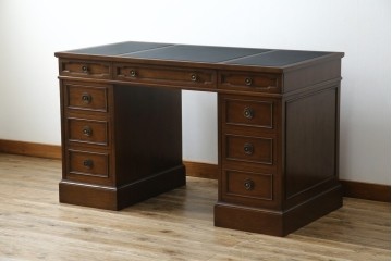 レザー張り天板の高級感漂うアンティークデスク。万年筆や羽根ペンが主流だった時代に、書き物がしやすい机として重宝された。レザーに金彩が入ったゴージャスな机もあり。