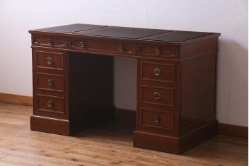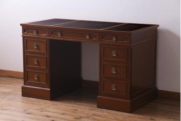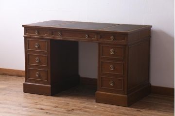 レザー張り天板の高級感漂うアンティークデスク。万年筆や羽根ペンが主流だった時代に、書き物がしやすい机として重宝された。レザーに金彩が入ったゴージャスな机もあり。