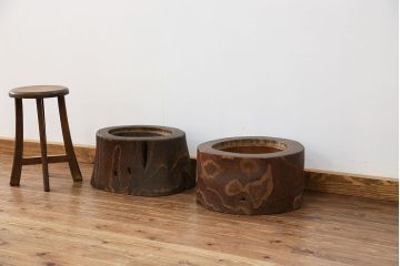 屋久杉材は、欅材や黒柿材の上を行く希少木材。耐久性が高く、ダイナミックで迫力のある木目をもっています。その個性豊かな形状を生かし、切り株をそのまま活用した、くりぬき火鉢もあります。屋久島が世界遺産に指定されてから、屋久杉の伐採が禁止されたため、屋久杉材の火鉢はなかなか出回っていません。