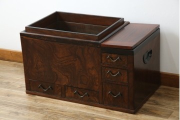 長火鉢や囲炉裏テーブルは、炉の部分にガラス天板を取り付けて、コレクションテーブル(ショーケーステーブル)にリメイクするのもおすすめ。店舗のディスプレイ什器にぴったりなショーケースに生まれ変わります。上質な長火鉢をリメイクすれば、高級感があって印象的な佇まいになりますよ。
