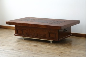 囲炉裏テーブルは、食事が楽しめる火鉢(囲炉裏)付きテーブルのこと。床座と椅子座で使えるものがあり。関西長火鉢よりも天板が広めで、炉には蓋が付いたものが多い。