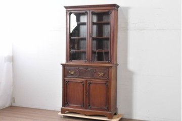 同じ西洋家具でもイギリスアンティークとは雰囲気の異なるフランスアンティークのブックケース。 扉の凝った装飾は家具の印象を引き締めており、収納したものをすっきりと見せます。 流れるような曲線を活かしたシルエットや、緻密なレリーフはお部屋にエレガントな印象を与え、ステンドグラスとはまた一味違った優美さが感じられますね。