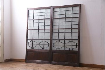 組子建具板戸やガラス戸、障子戸、欄間などの一部に組子細工が入ったアンティーク建具。麻の葉や胡麻、菱など伝統的な美しい文様が楽しめる。間仕切り建具におすすめ。