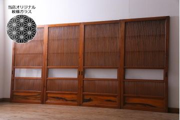 アンティークの組子板戸を取り入れた和モダンなダイニングインテリア。凛とした組子細工がインテリアのアクセントになって、落ち着いた高級感のある雰囲気を演出しています。4枚組の組子板戸は迫力満点で、店舗や旅館、和モダンなホテルなどにも人気の和風建具です。美しい伝統工芸をインテリアとして楽しめます。