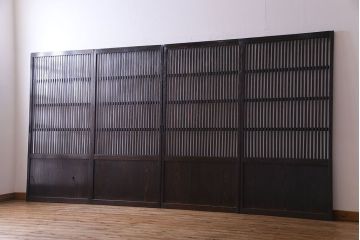 アンティークの組子板戸を取り入れた和モダンなダイニングインテリア。凛とした組子細工がインテリアのアクセントになって、落ち着いた高級感のある雰囲気を演出しています。4枚組の組子板戸は迫力満点で、店舗や旅館、和モダンなホテルなどにも人気の和風建具です。美しい伝統工芸をインテリアとして楽しめます。