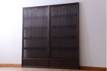 こちらは、シンプルなアンティークガラス戸を取り入れた和モダンなリビングインテリア。ガラス面が大きく、明るい開放的な雰囲気です。収納家具やテーブルには和風のアンティーク家具を使って、伝統的な味わいを感じるリビングになりました。全体的に背の低い家具でコーディネートしている分、大きなアンティークガラス戸がいいアクセントになっています。