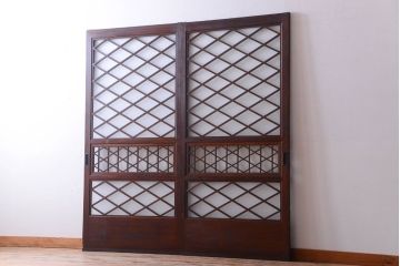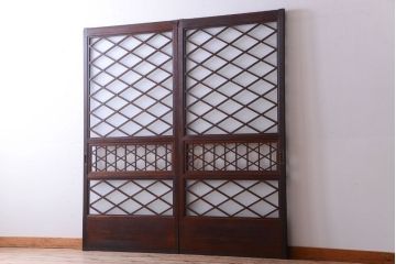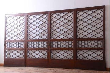 組子建具板戸やガラス戸、障子戸、欄間などの一部に組子細工が入ったアンティーク建具。麻の葉や胡麻、菱など伝統的な美しい文様が楽しめる。間仕切り建具におすすめ。