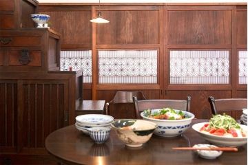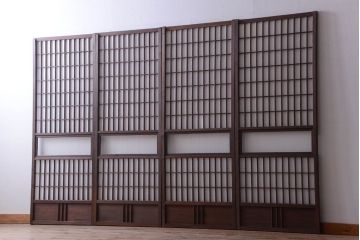 アンティークの組子板戸を取り入れた和モダンなダイニングインテリア。凛とした組子細工がインテリアのアクセントになって、落ち着いた高級感のある雰囲気を演出しています。4枚組の組子板戸は迫力満点で、店舗や旅館、和モダンなホテルなどにも人気の和風建具です。美しい伝統工芸をインテリアとして楽しめます。
