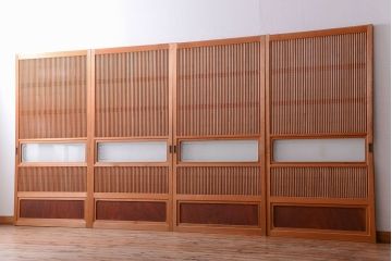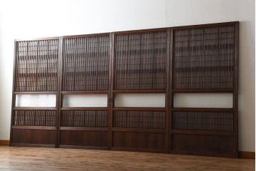 アンティークの組子板戸を取り入れた和モダンなダイニングインテリア。凛とした組子細工がインテリアのアクセントになって、落ち着いた高級感のある雰囲気を演出しています。4枚組の組子板戸は迫力満点で、店舗や旅館、和モダンなホテルなどにも人気の和風建具です。美しい伝統工芸をインテリアとして楽しめます。